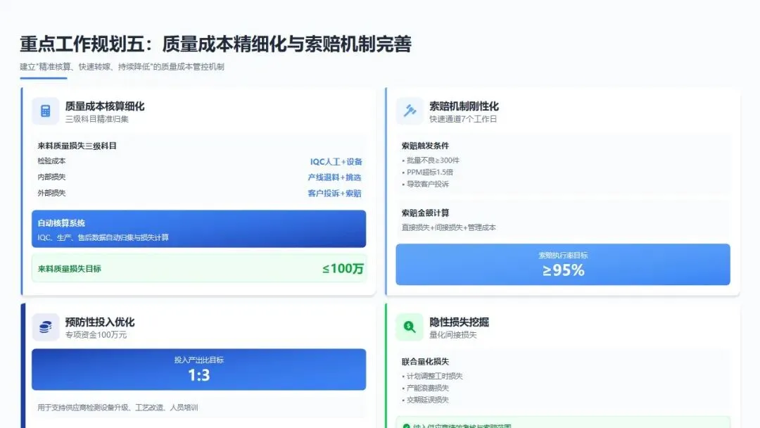 战略目标:建立"精准核算、快速转嫁、持续降低"的质量成本管控机制,实现来料质量损失≤100万元,索赔执行率≥95%。