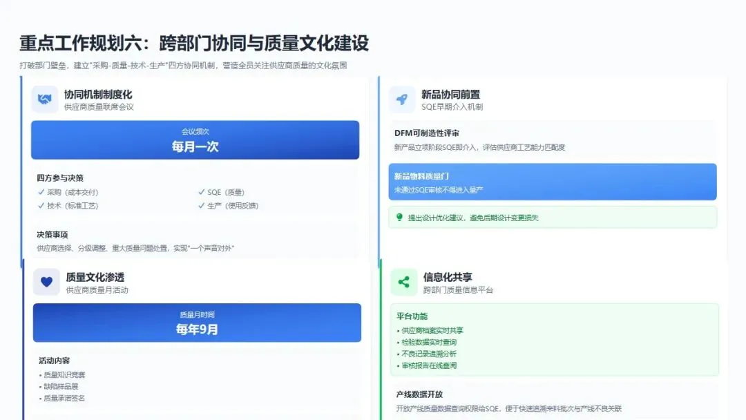 战略目标:打破部门壁垒,建立"采购-质量-技术-生产"四方协同机制,营造"全员关注供应商质量"的文化氛围。