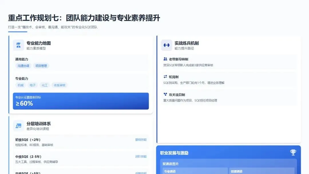 战略目标:打造一支"懂技术、会审核、善沟通、能攻关"的专业化SQE团队,团队专业认证覆盖率≥60%,人均审核能力≥20家/年。