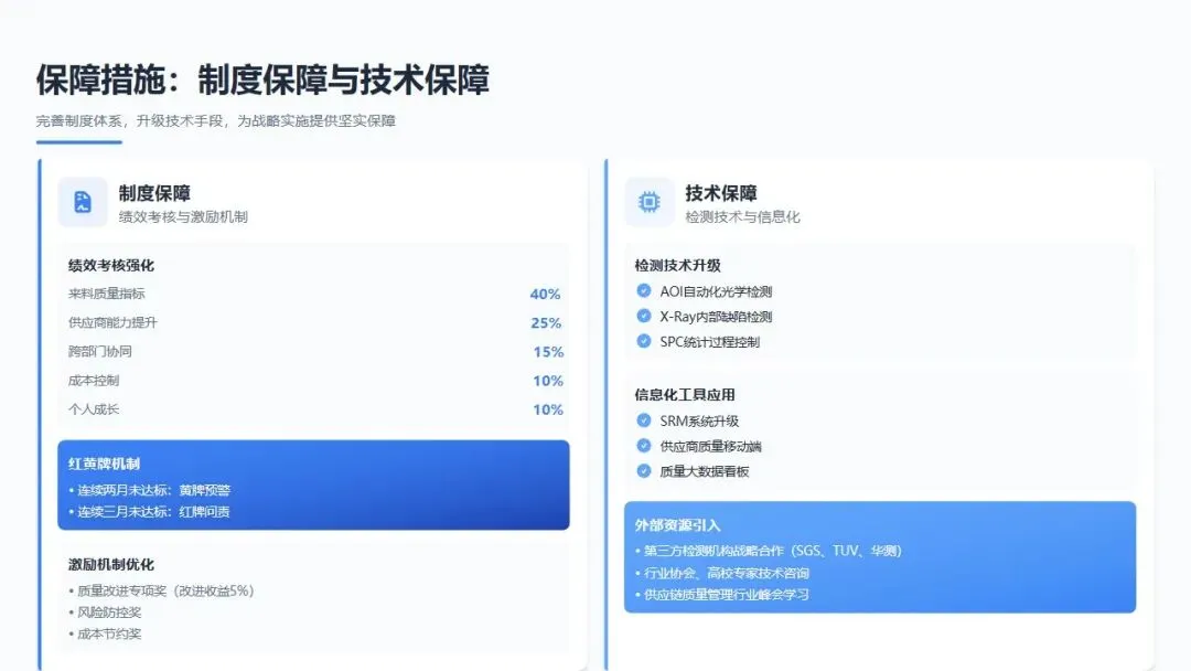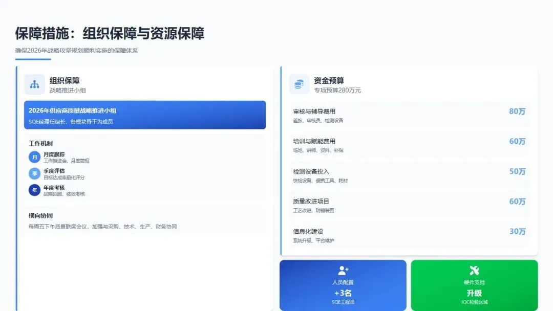 设立"供应商质量改进专项资金"100万元,用于支持供应商检测设备升级、工艺改造、人员培训;建立投入产出评估机制,确保每投入1元至少减少3元质量损失。
