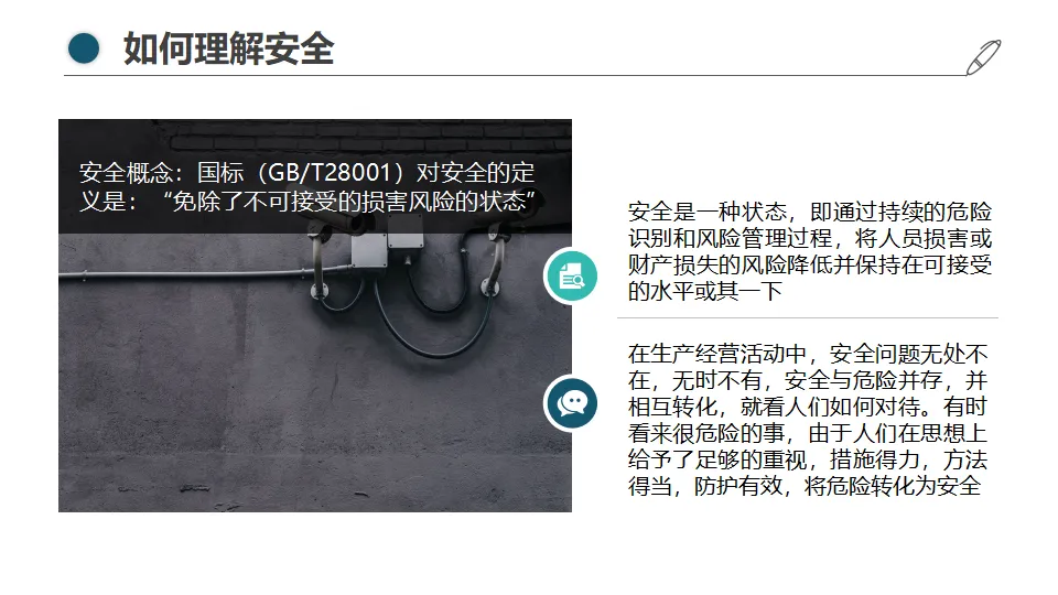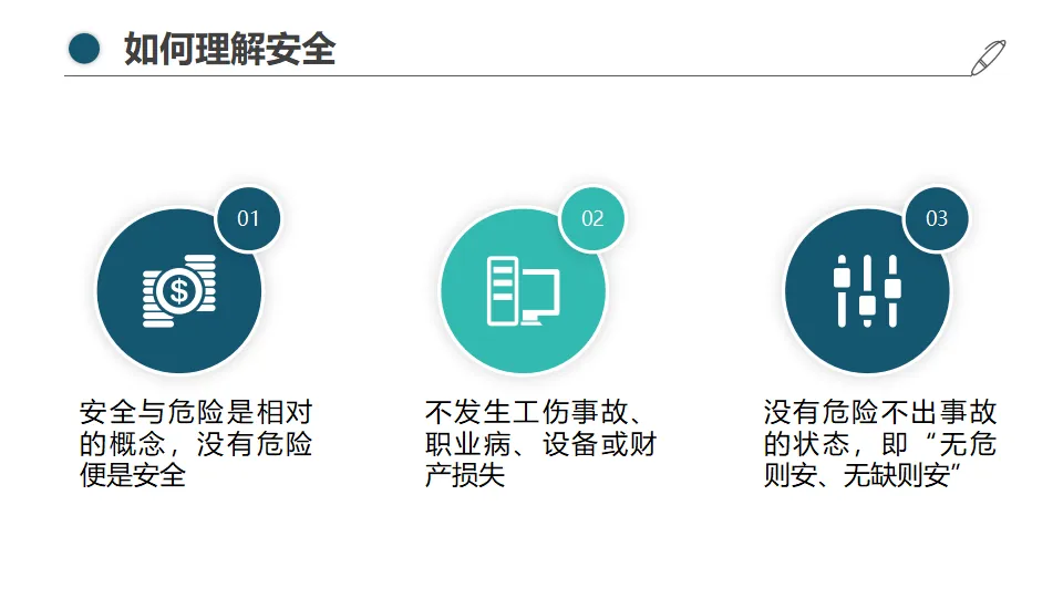 :安全与危险是相对的概念,没有危险便是安全。在生产经营活动中,安全是指不发生工伤事故、职业病、设备或财产损失的状态。古人云"无危则安、无缺则全",正是此意。