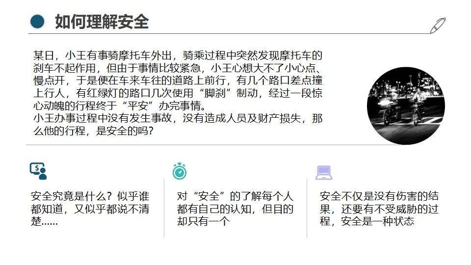 。安全不仅是没有伤害的结果,更是一种不受威胁的过程状态。安全是一种通过持续的危险识别和风险管理过程,将人员损害或财产损失的风险降低并保持在可接受水平的状态。小王的"冒险之旅"充满了威胁,只是侥幸未出事,这绝不是安全。