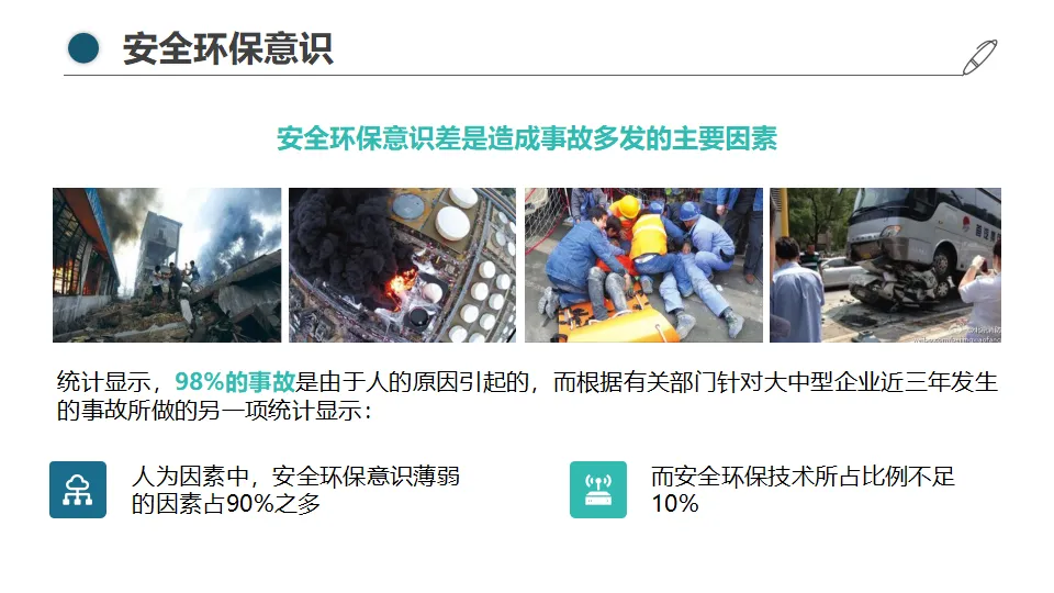 。在人为因素中,安全环保意识薄弱的因素占90%之多,而安全环保技术所占比例不足10%。这揭示了一个残酷的现实:绝大多数事故不是因为技术不够先进、设备不够精良,而是因为人的意识不到位。