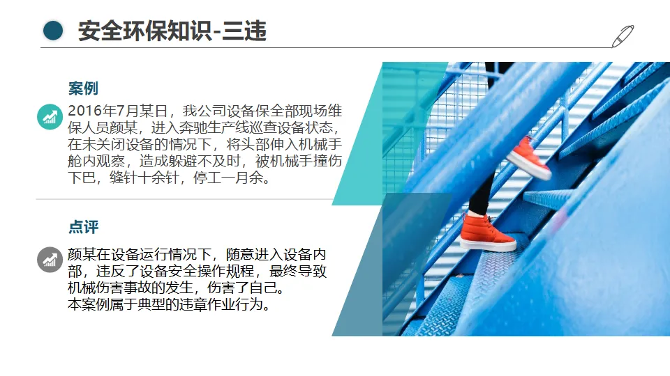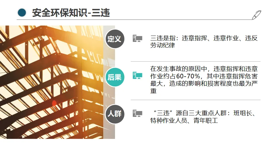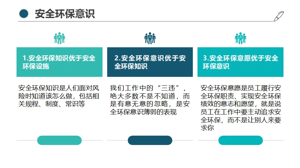 :我们工作中的"三违"(违章指挥、违章作业、违反劳动纪律),绝大多数不是不知道规定,而是有意无意地忽略,是安全环保意识薄弱的表现。
