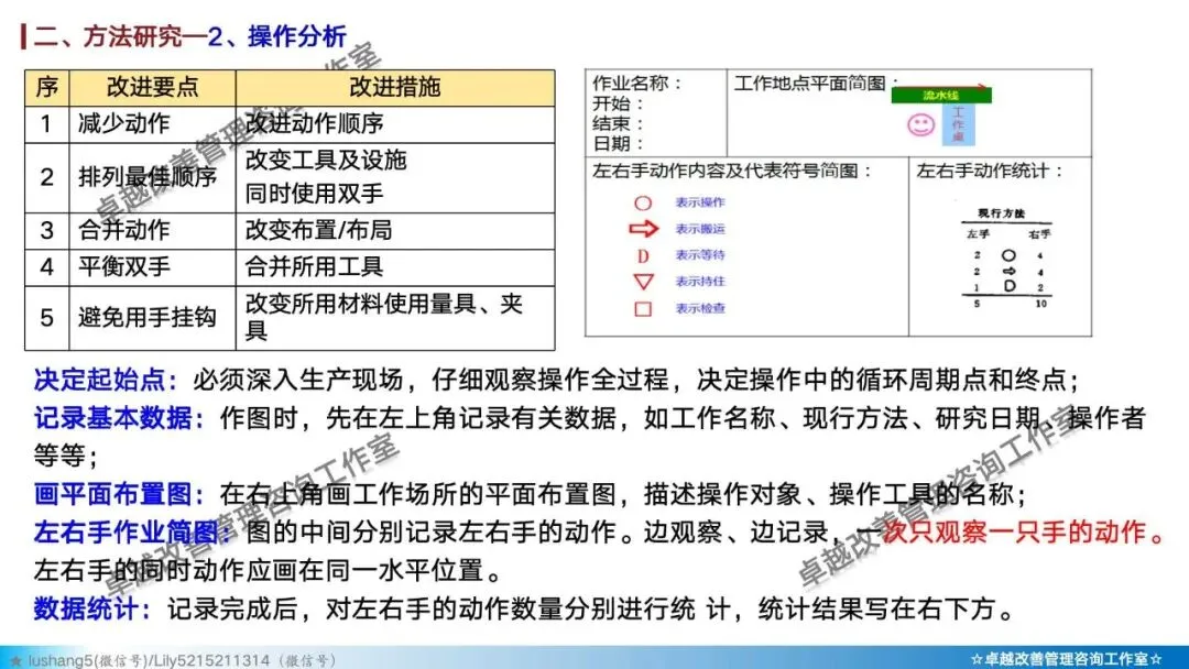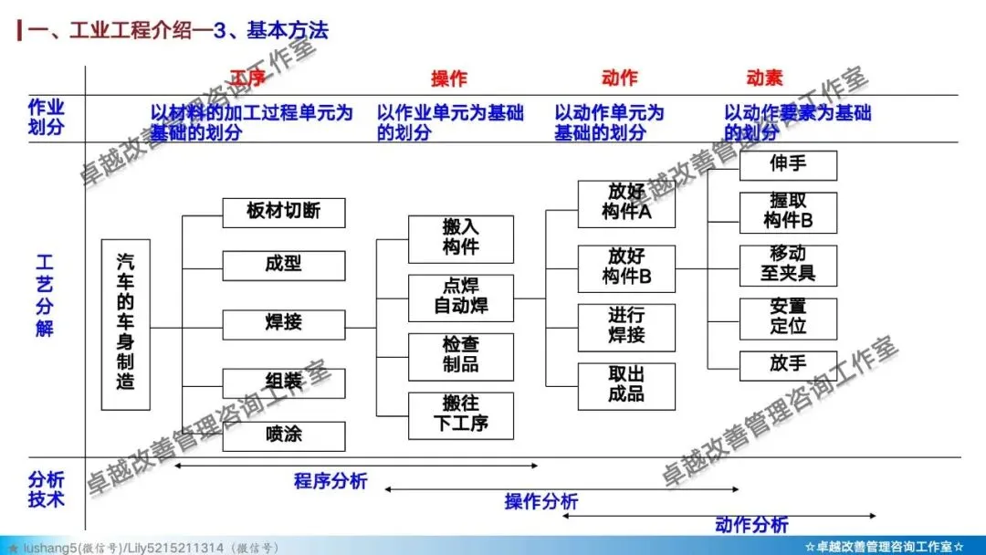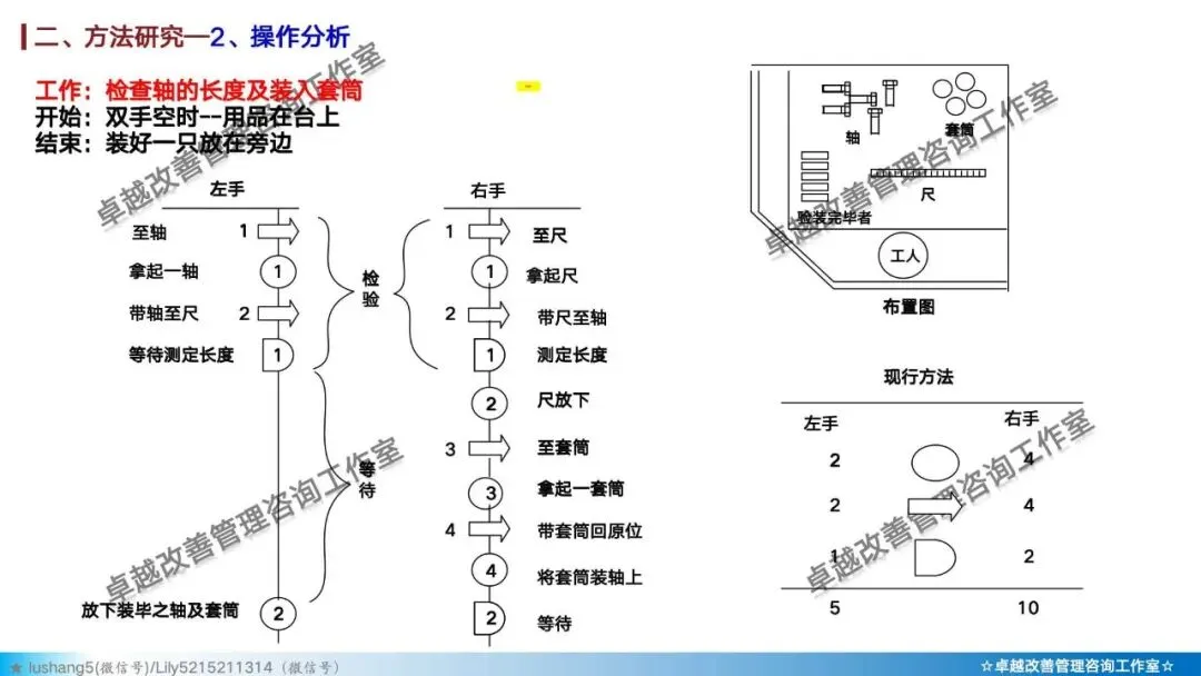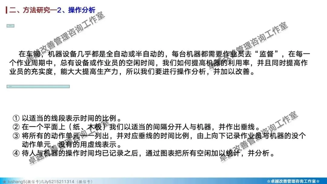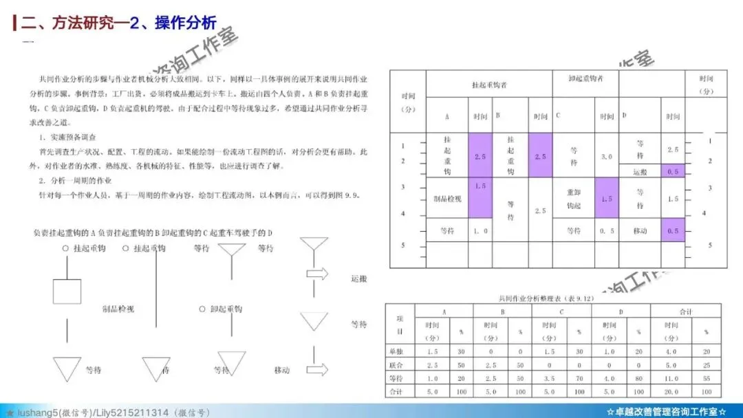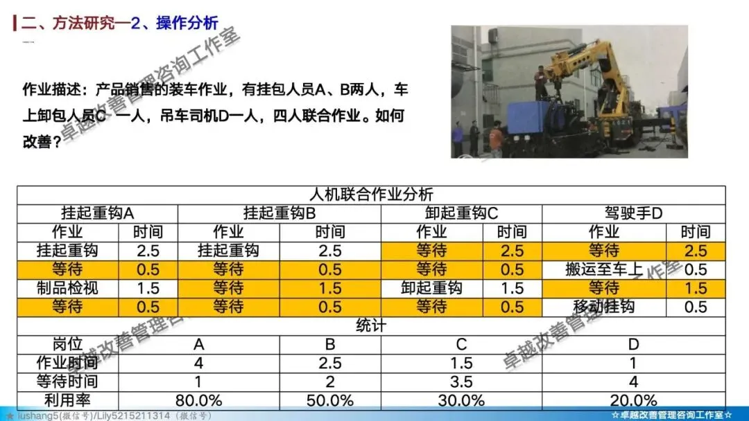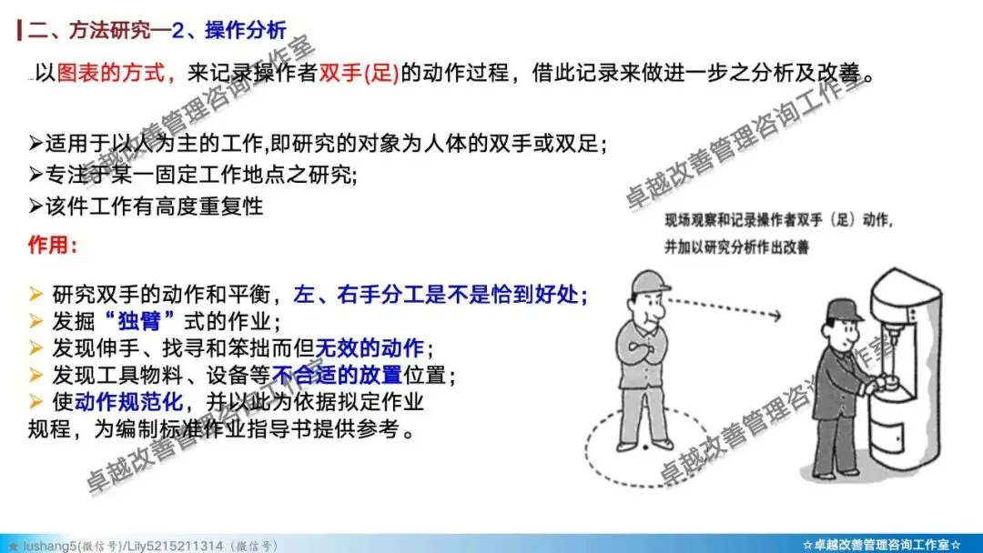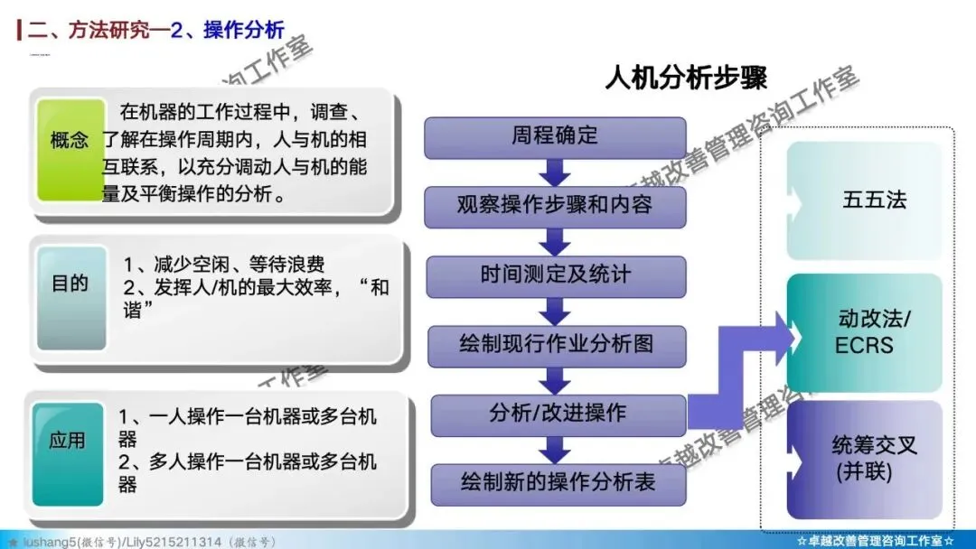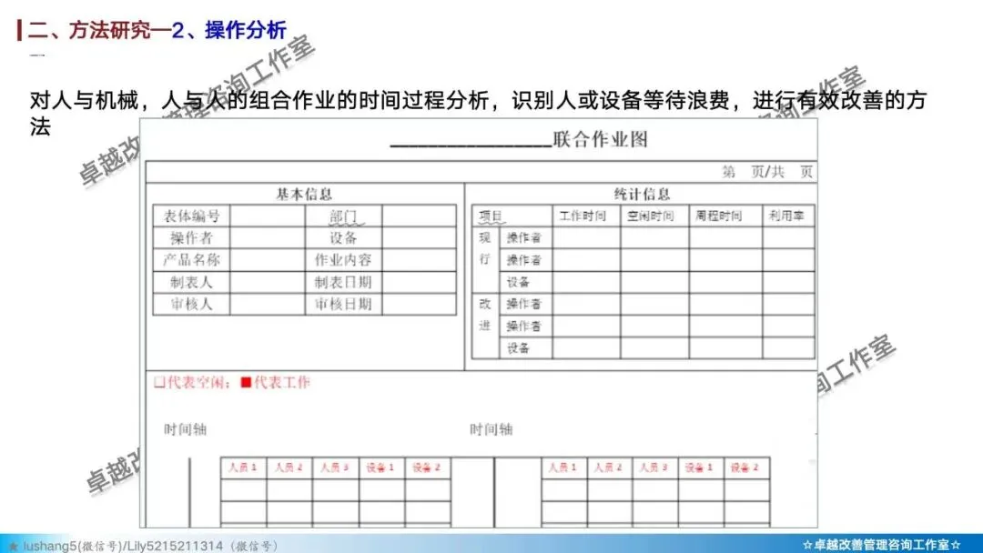 · 作业分析:聚焦于某个具体工序或工位,研究人机配合是否高效,或者多人联合作业是否协调,通过人机作业分析、联合作业分析等改善作业结构 。