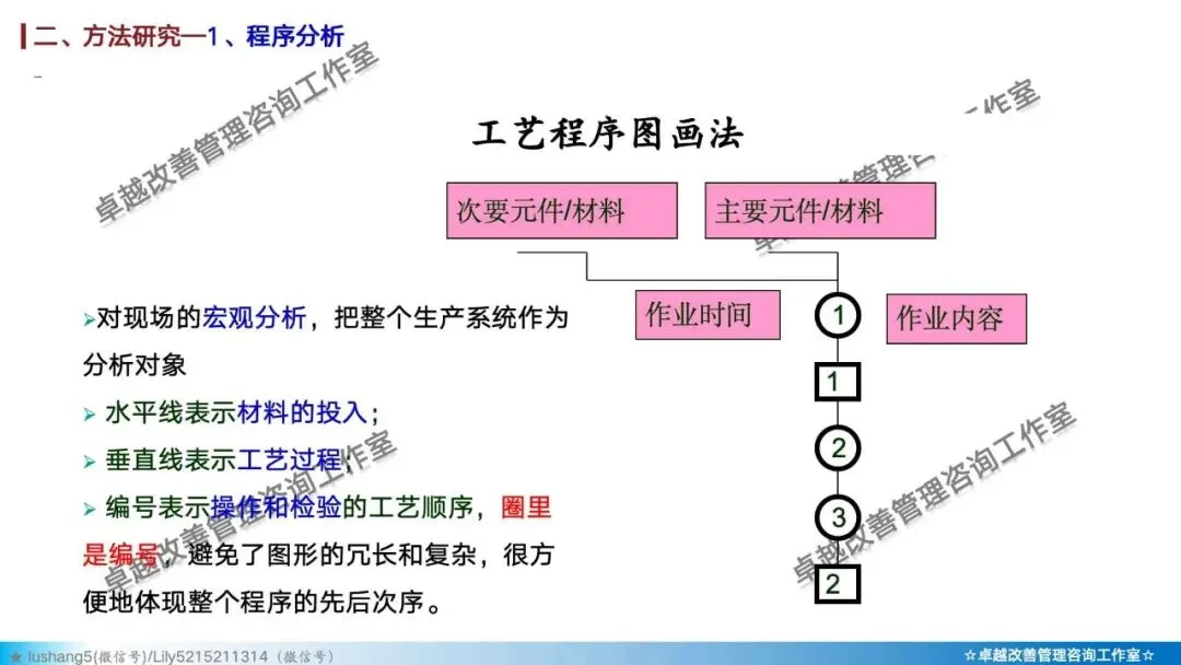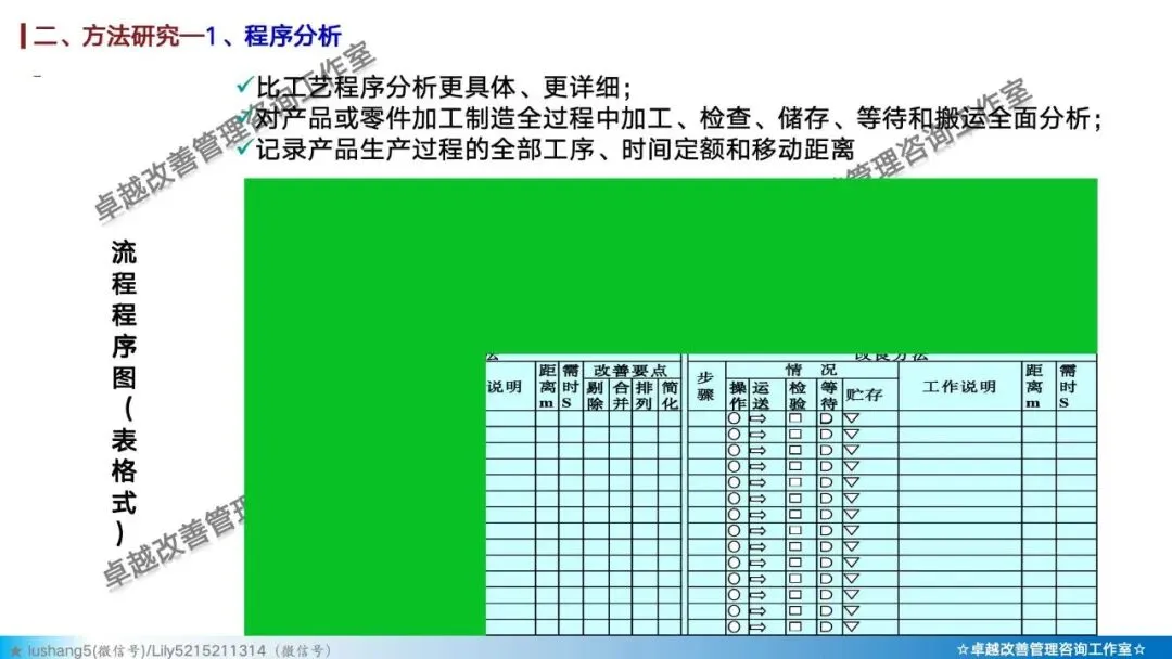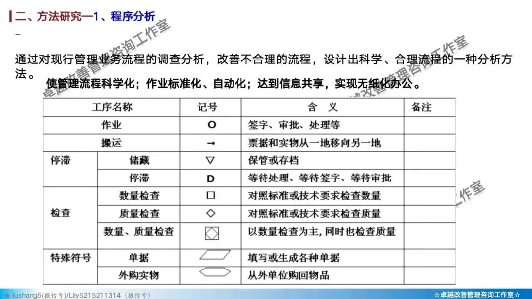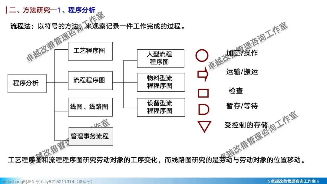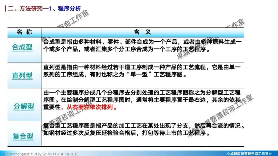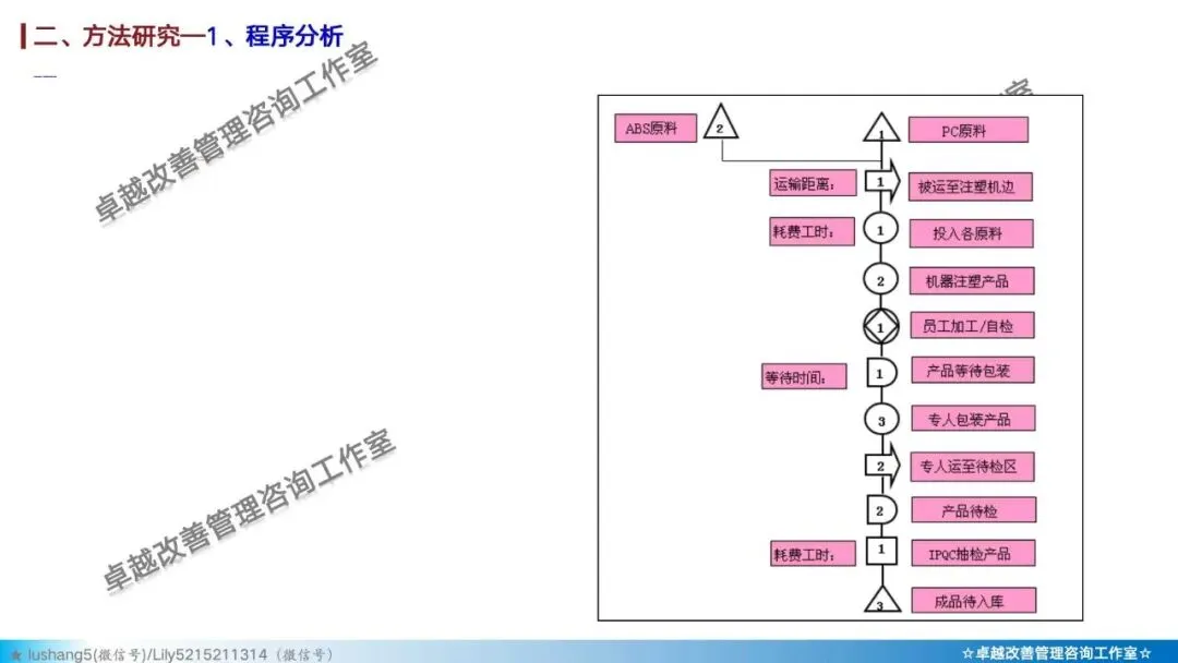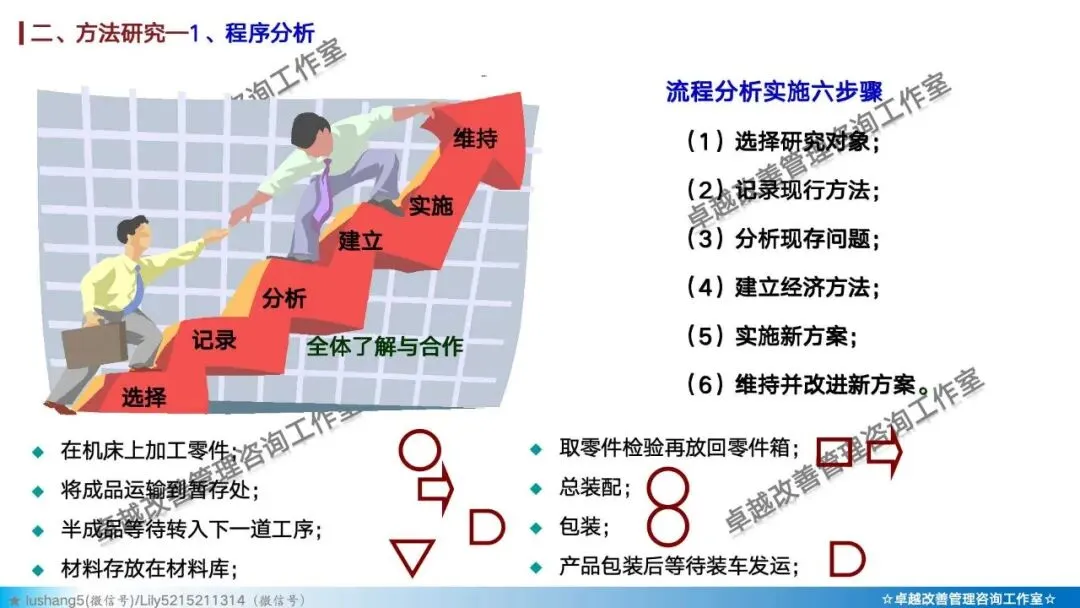 · 程序分析:从宏观视角审视整个生产流程,通过工艺程序图、流程程序图等工具,分析有无多余或重复的环节,优化整体路线 。