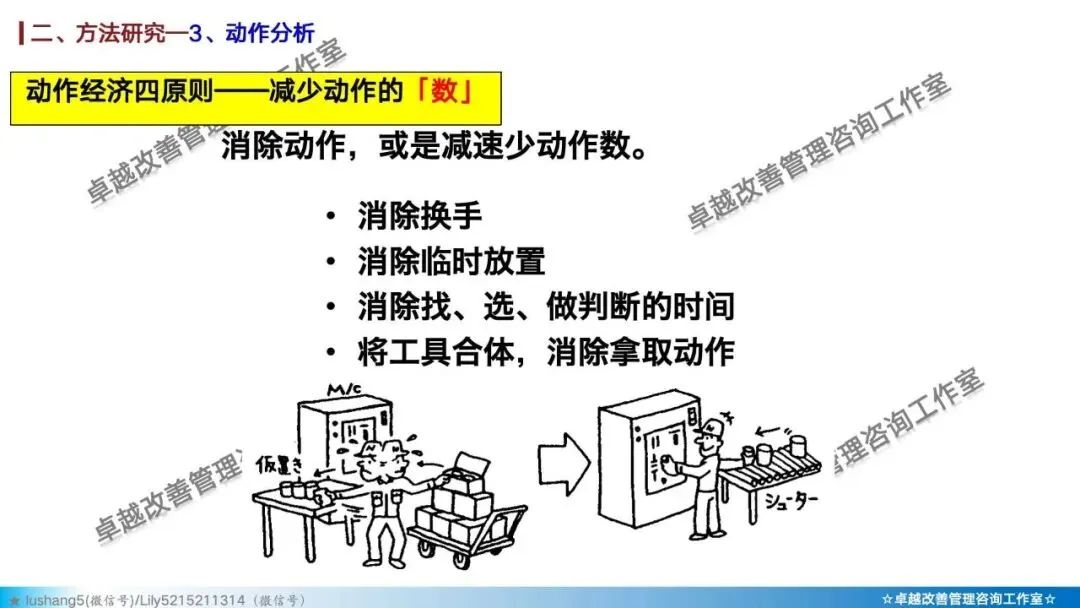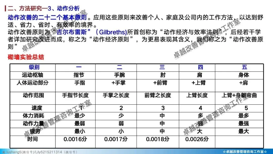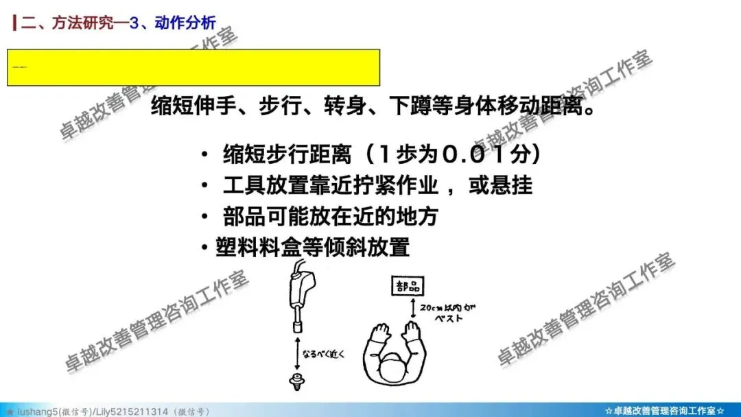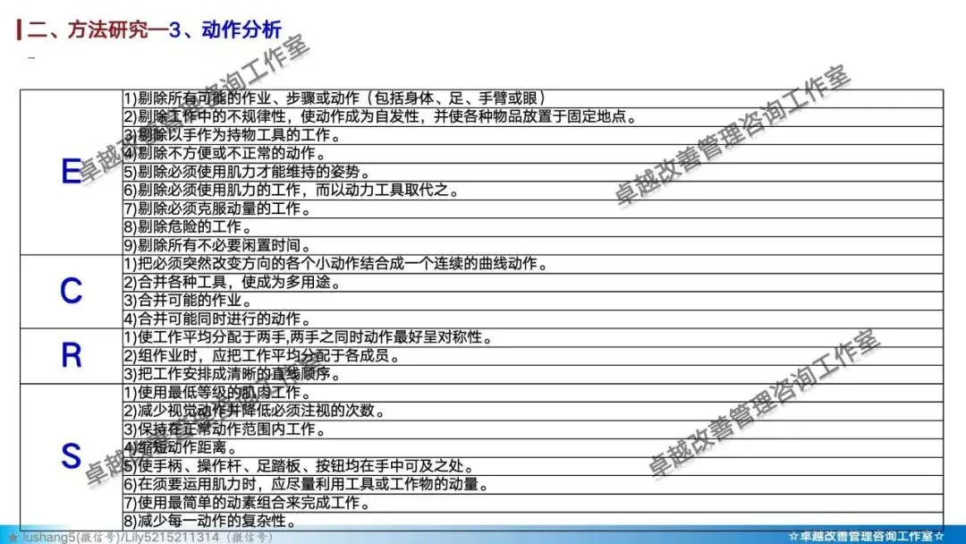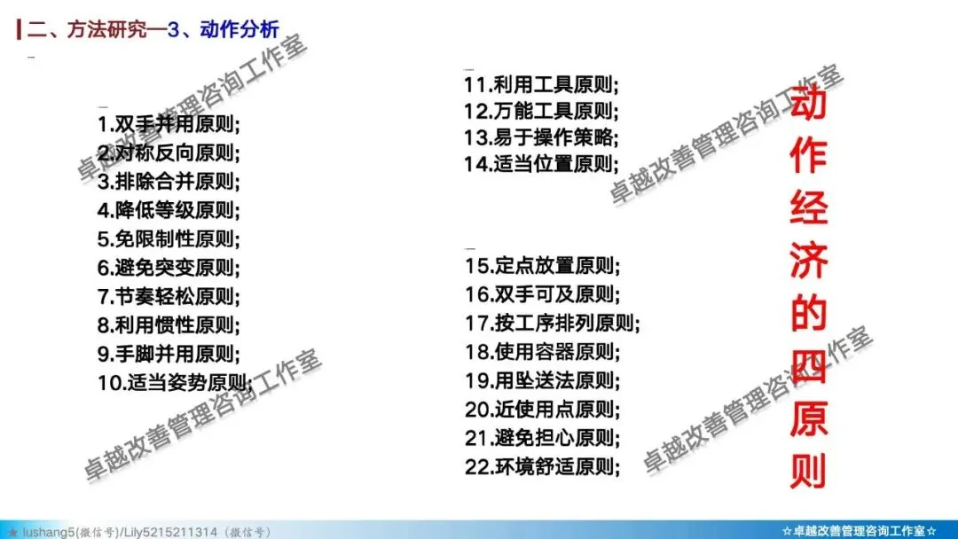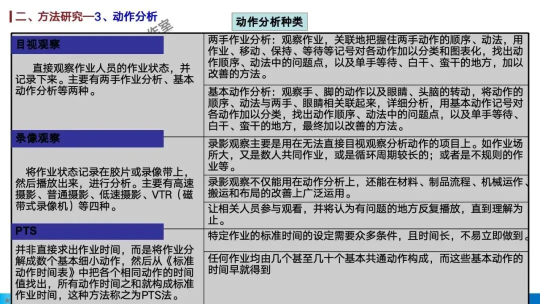 · 动作分析:在最微观的层面研究操作者的动作,区分有效动作与无效动作,并遵循动作经济原则(如双手同时作业、动作距离最短等)来设计工作地,减轻疲劳 。