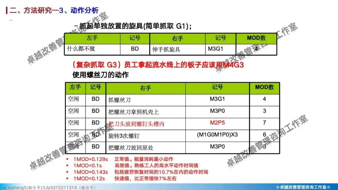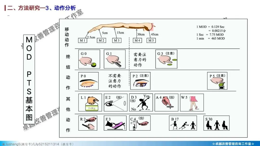 · 预定动作时间标准法:如模特排时法,通过查表预先为每个动作赋予时间值。