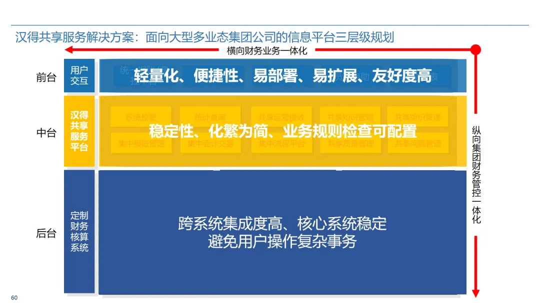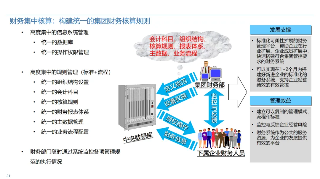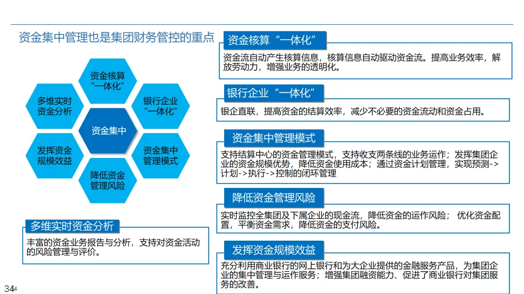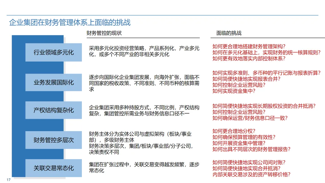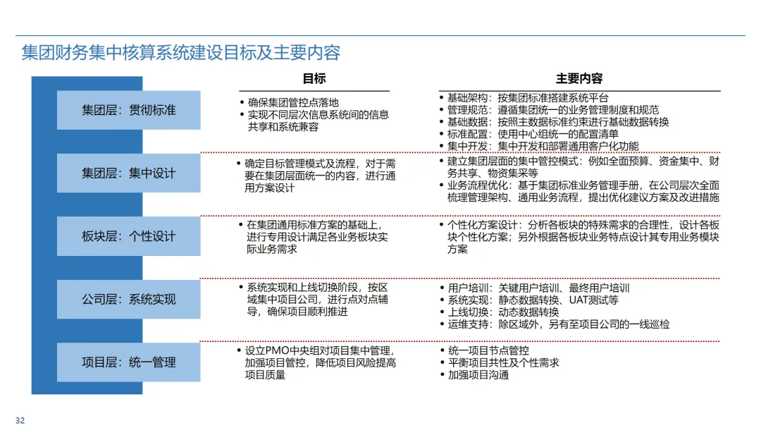 集团管控以财务管控为核心,搭建财务核算、资金管理、合并报表、全面预算、财务共享、决策分析六大体系。统一核算口径与规则,实现资金集中管理与风险管控,搭建合并报表统一平台,落地战略导向的全面预算管理,通过财务共享实现流程标准化,依托 BI 分析为决策提供数据支撑,同时完成集团集采、人力资本管控的标准化搭建,实现集团层面的全域统筹与高效管控。