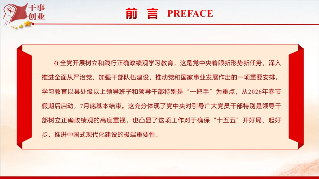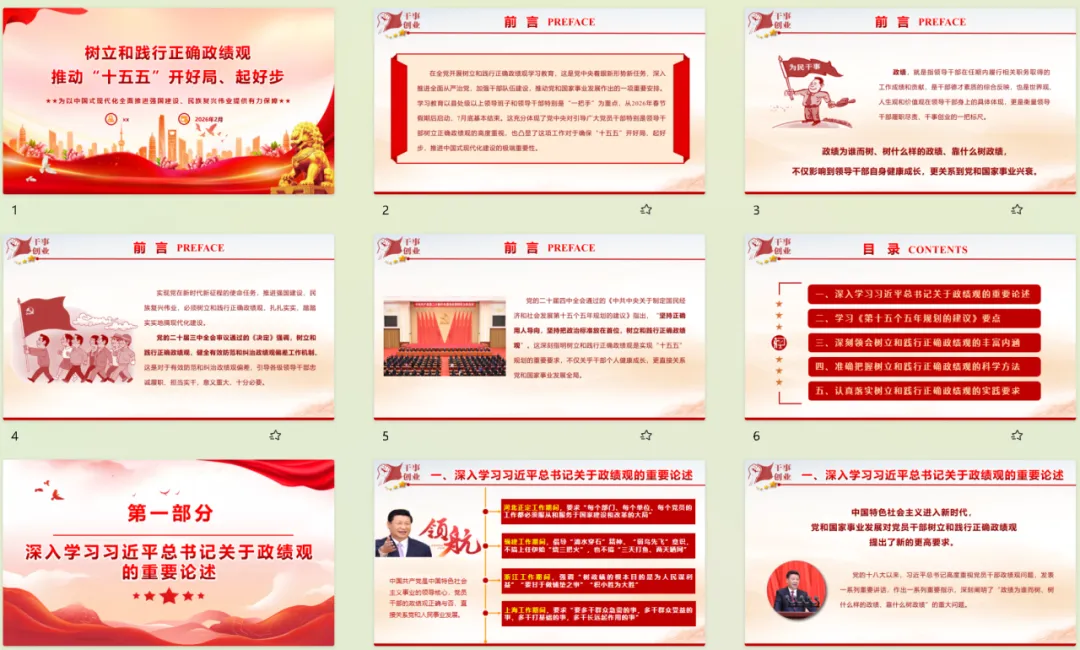 最新推出的2026年政绩观学习教育专题PPT资料《树立和践行正确政绩观,推动“十五五”开好局、起好步》,围绕“十五五”开局新形势,深入讲解政绩观的重要论述。
