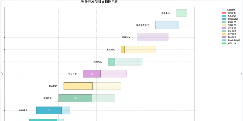 - 使用堆积条形图直观展示项目各任务的时间安排与进度。