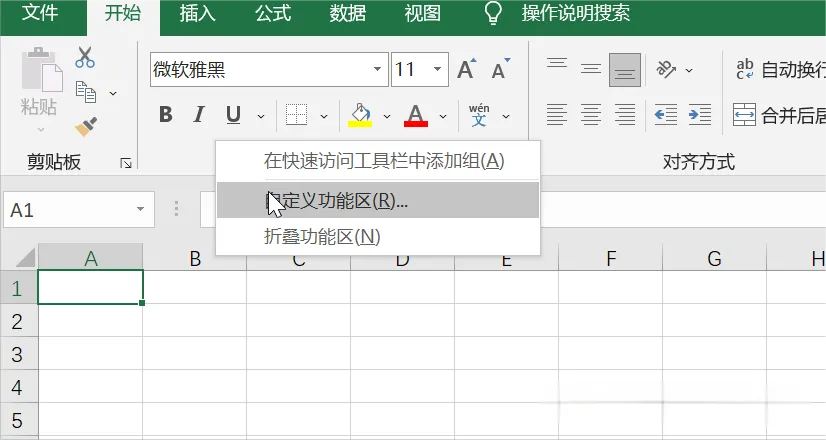 若这个功能区未显示在界面上,可右键点击功能区中的空白处,选择“自定义功能区”,↓