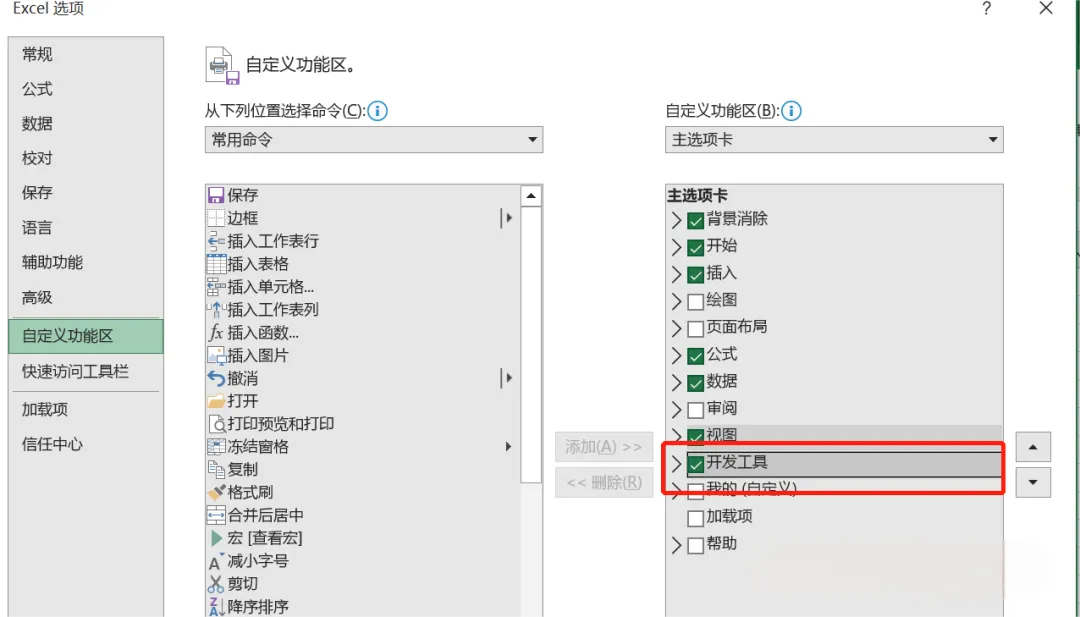 在弹出的Excel选项中勾选“开发工具”,点击确定后,“开发工具”选项卡就会出现在功能区。