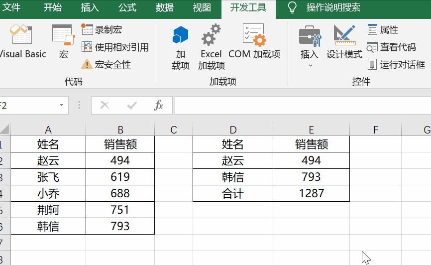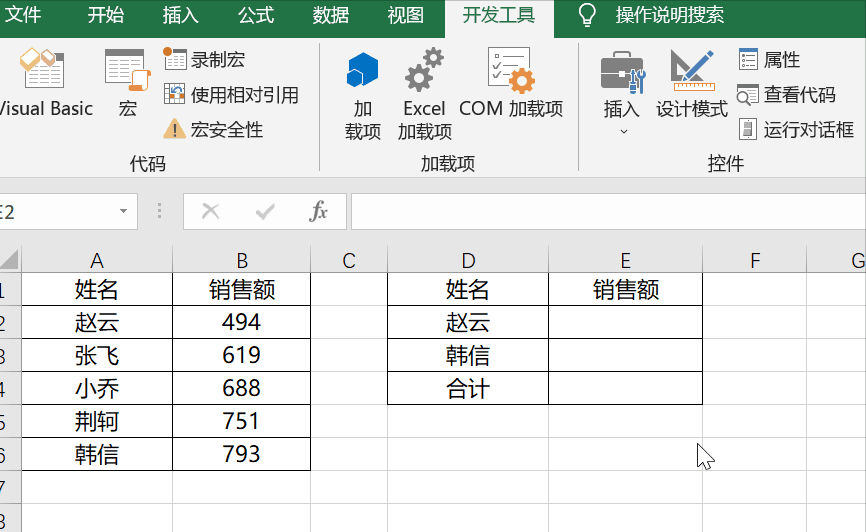 学会启用宏后,来看看如何录制一个宏。以自动匹配员工销售额并求和为例,先找到宏录制功能所在的“开发工具”选项卡。