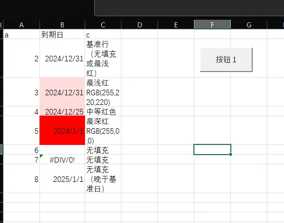 ' 类名:DateGradientFormatter ' 属性:Worksheet, HeaderText, BaseDateRow, ColorStart, ColorEnd ' 方法:ApplyFormatting, ClearFormatting ' 使用示例: Dim fmt As New DateGradientFormatter With fmt Set .TargetSheet = ThisWorkbook.Worksheets("总表") .HeaderText = "到期日" .ApplyFormatting End With 测试用例 创建如下测试数据验证代码: