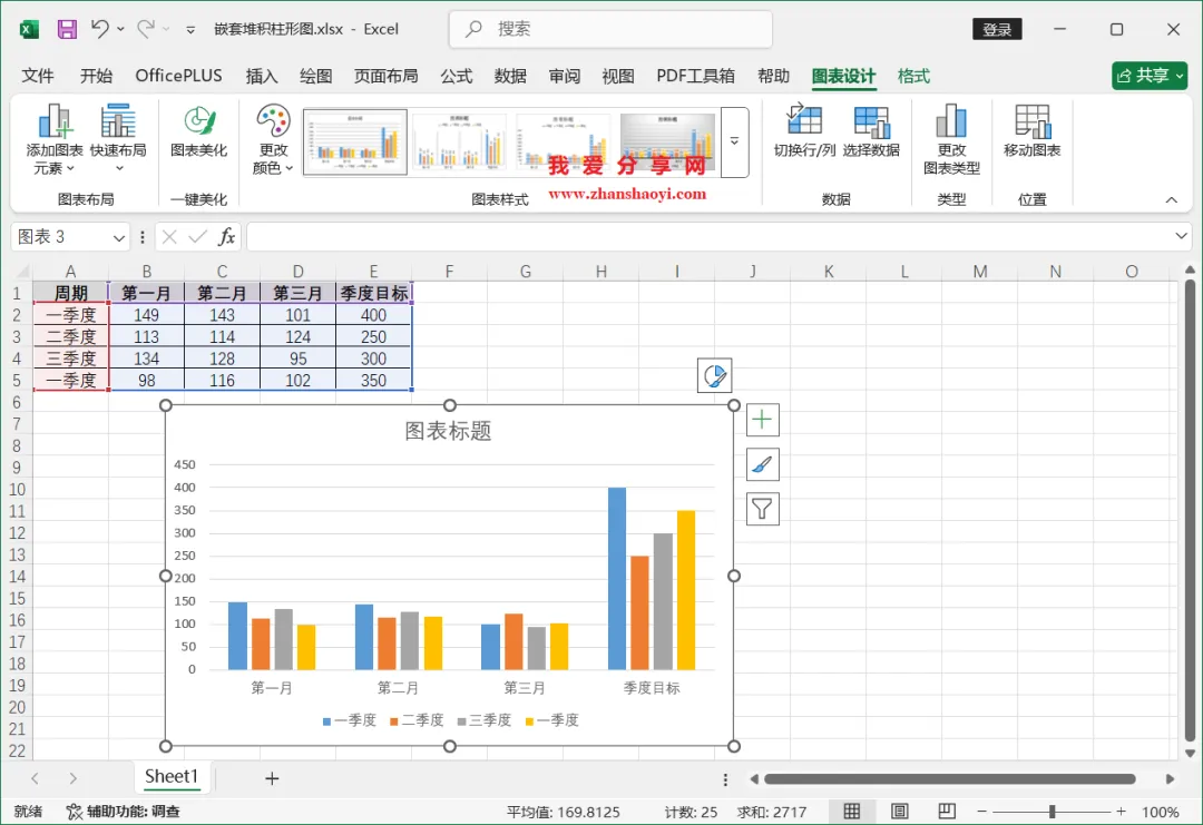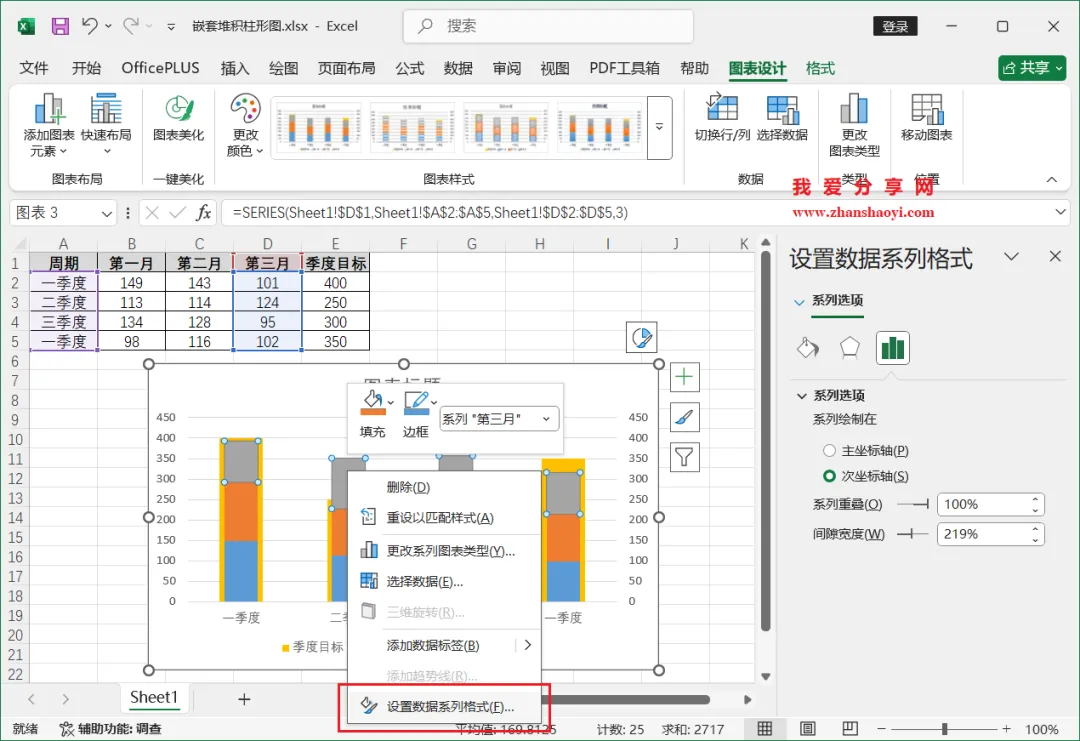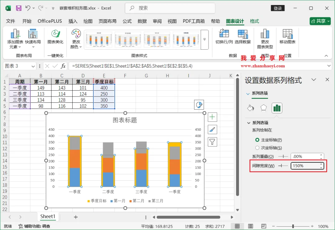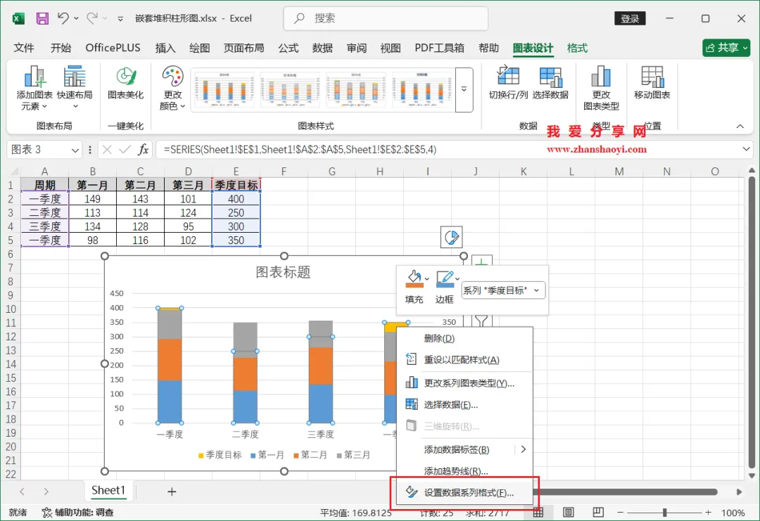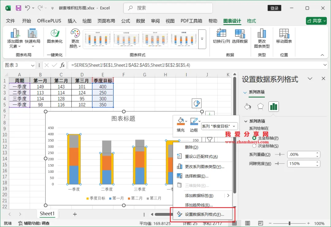http://www.zhanshaoyi.com/24060.html8、调整后的柱形图效果如下,第二步,设置嵌套效果,鼠标右击季度目标系列(黄色柱形)选择【设置数据系列格式】;