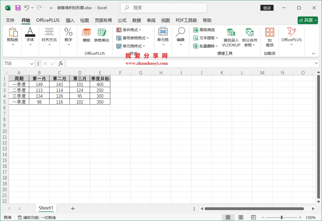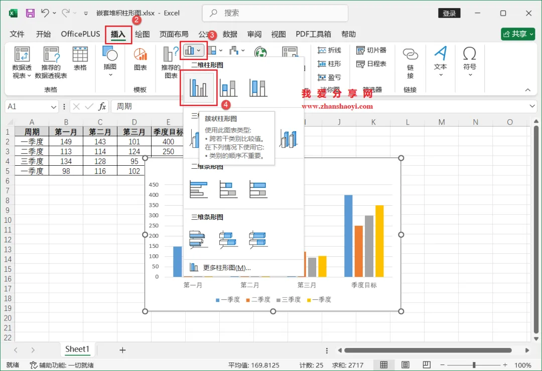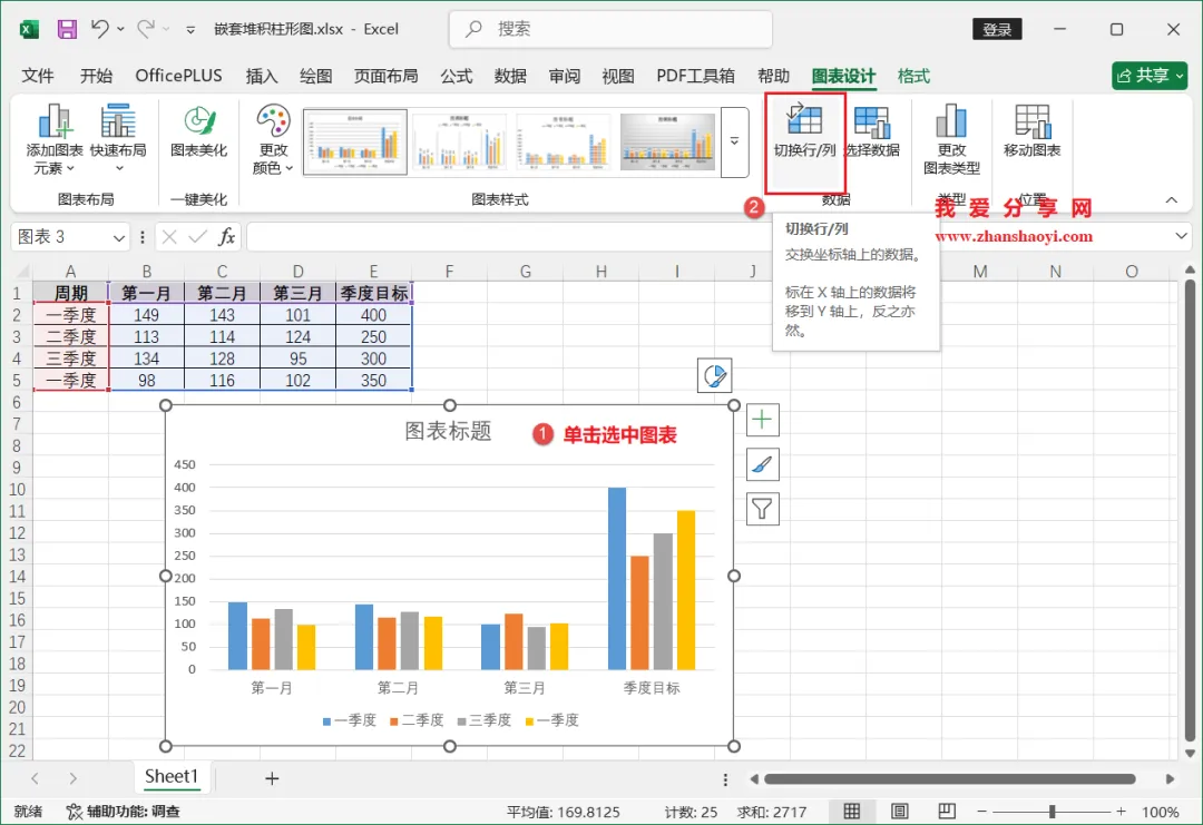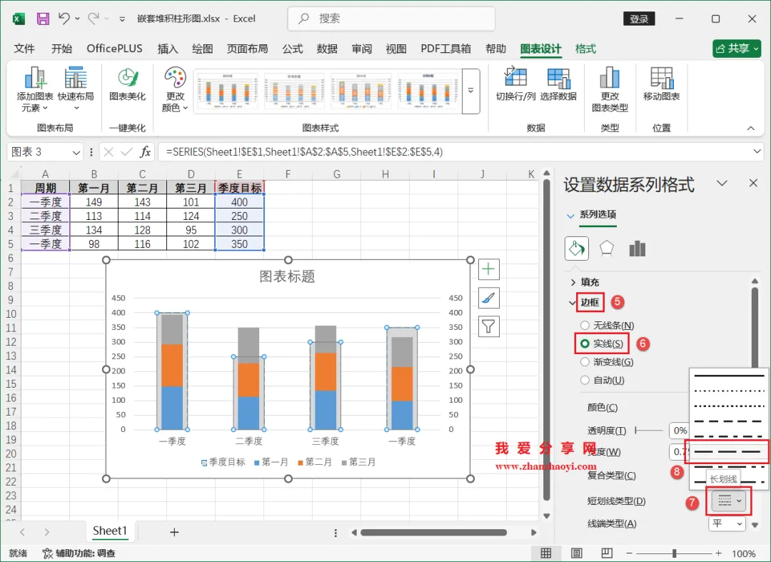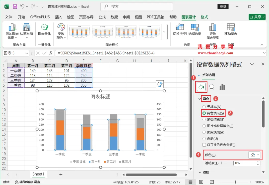 http://www.zhanshaoyi.com/24060.html8、调整后的柱形图效果如下,第二步,设置嵌套效果,鼠标右击季度目标系列(黄色柱形)选择【设置数据系列格式】;