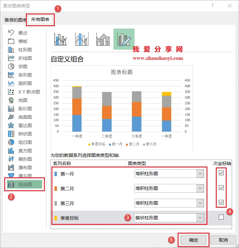 7、各系列图表类型及主次坐标轴设置如下图所示,把第一月、第二月、第三月年系列放置在次坐标轴,然后点击【确定】,注意:这里将第一/二/三月放在次坐标轴目的是柱形不被季度目标柱形遮挡;