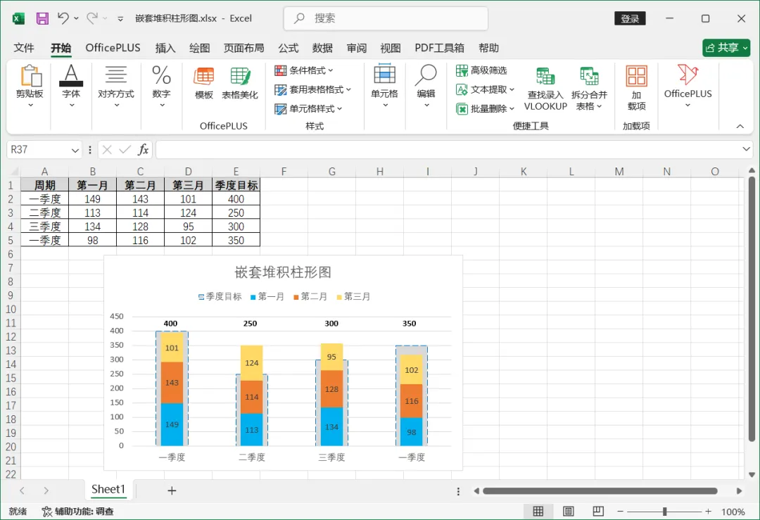 本期给大家分享Excel中绘制嵌套堆积柱形图,如下,堆积柱形展示每个月份的达成值,后侧虚线框柱形展示总目标,清晰呈现出多季度实际达成值和总目标值横向对比;