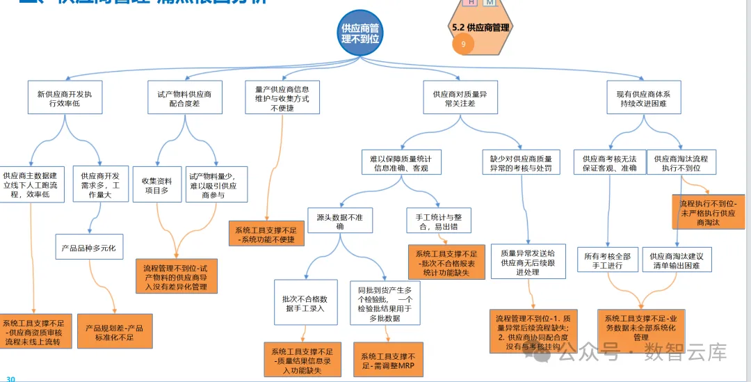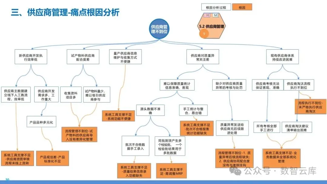 供应商管理的痛点根因分析涉及深入分析供应商相关问题的根本原因,例如: