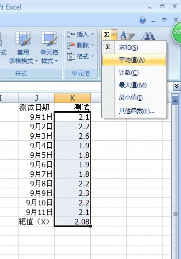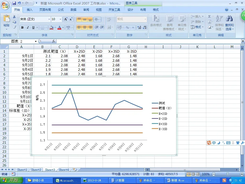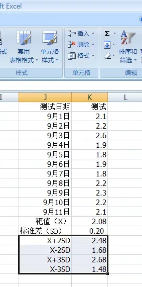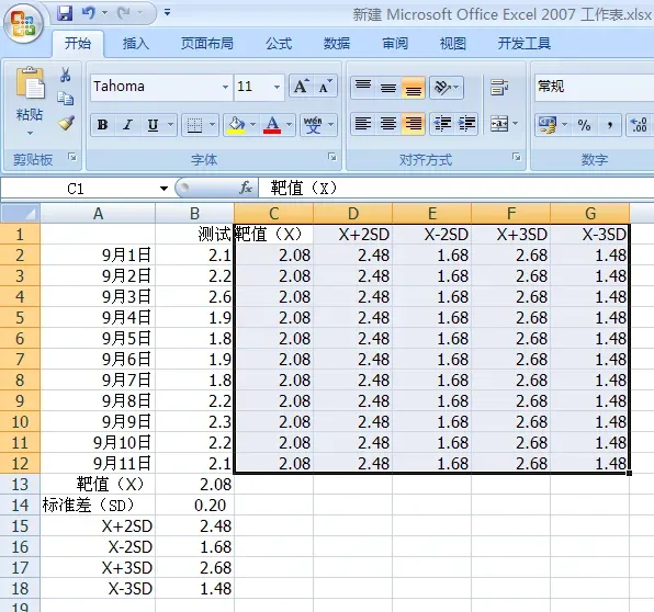首先把每天的质控数据和测试日期均输入Excel表并标示“测试日期”和“测试”,按规定(一般为前20次试验数据)算出“靶值(X)”。如图1: