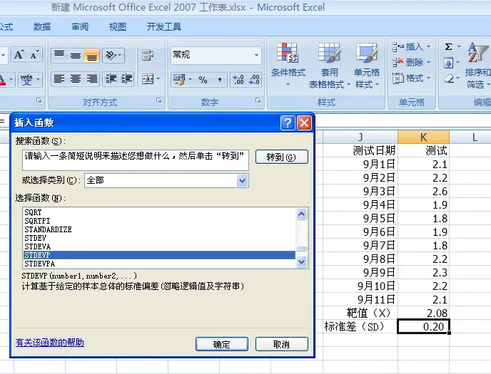 按标准差计算规定,插入函数“STDEVP”算出“标准差(SD)”。如图2: