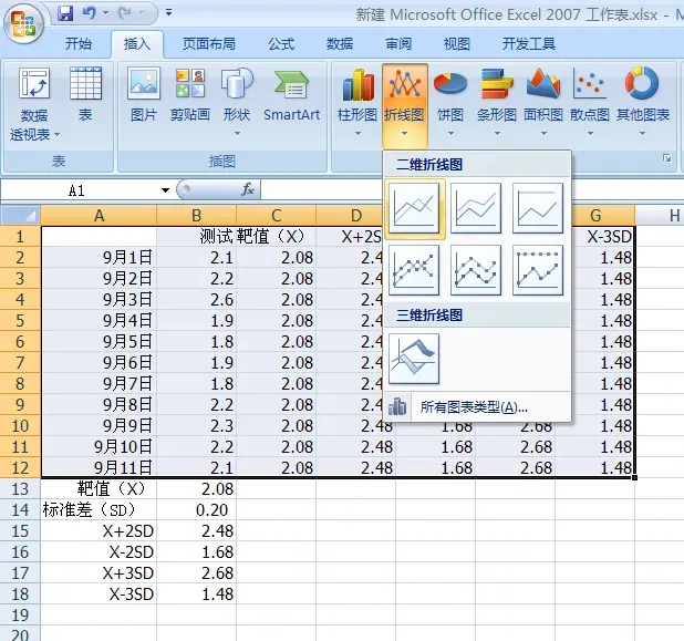 选中日期、测试、靶值、X+2SD、X-2SD、X+3SD、X-3SD数据后,点击“插入”、“折线图”“二维折线图(第一个)”。如图5: