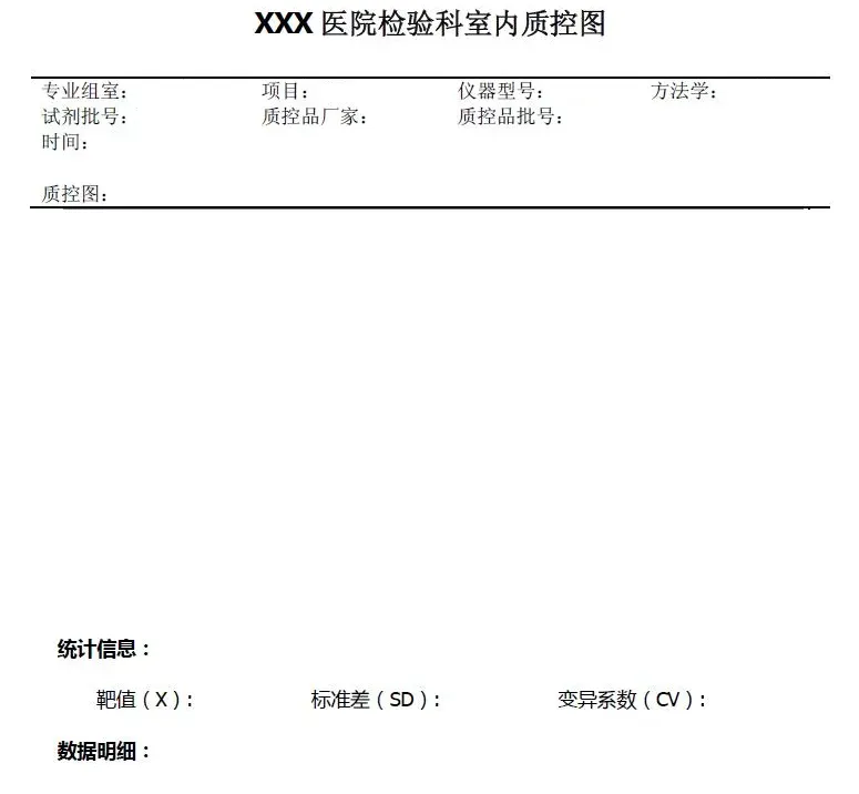 建立室内质控图模板,主要包括专业组室、项目名称、仪器型号、方法学、试剂批号、质控品厂家、质控品批号、统计质控时间、统计信息(靶值、标准差、变异系数)、数据明细等内容。如图7: