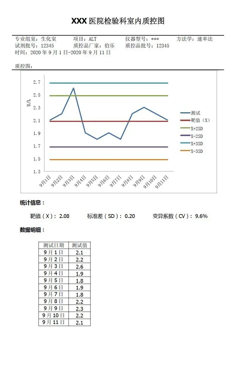 将图6形成的质控图以及专业组室、项目名称、仪器型号、方法学、试剂批号、质控品厂家、质控品批号、统计质控时间、统计信息(靶值、标准差、变异系数)、数据明细等质控信息依次插入和填写入图7所示质控图模板,最终形成质控图报告,如图8。
