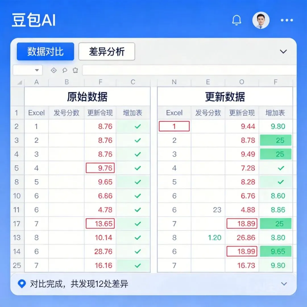 豆包会自动帮你对比,列出有差异的行。比如它可能会告诉你: