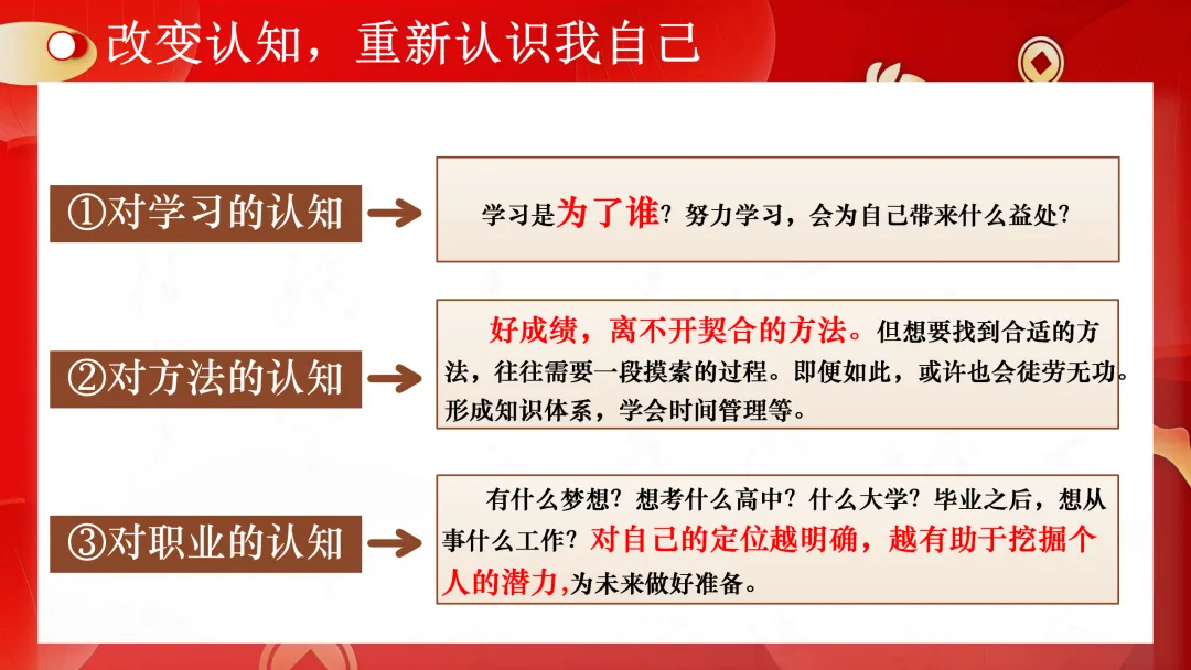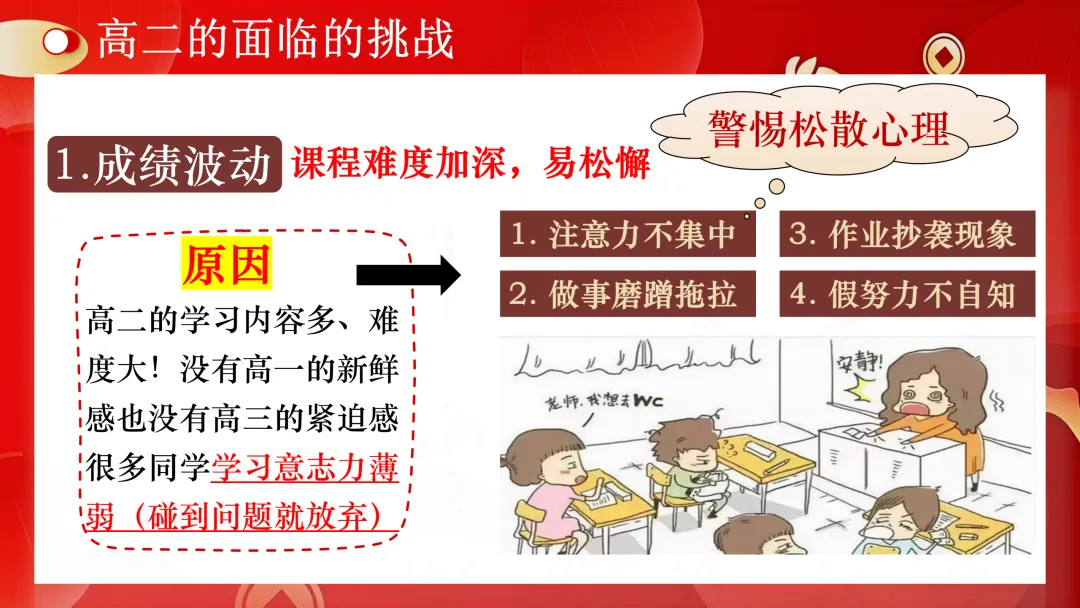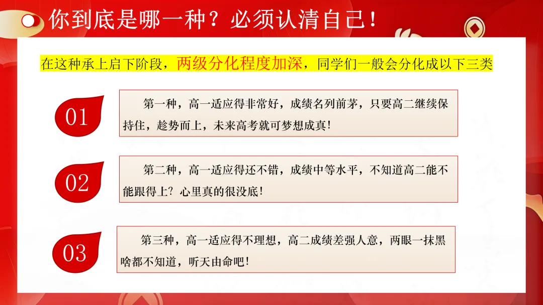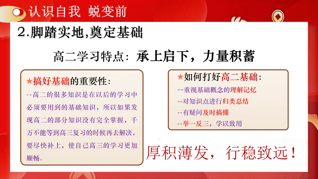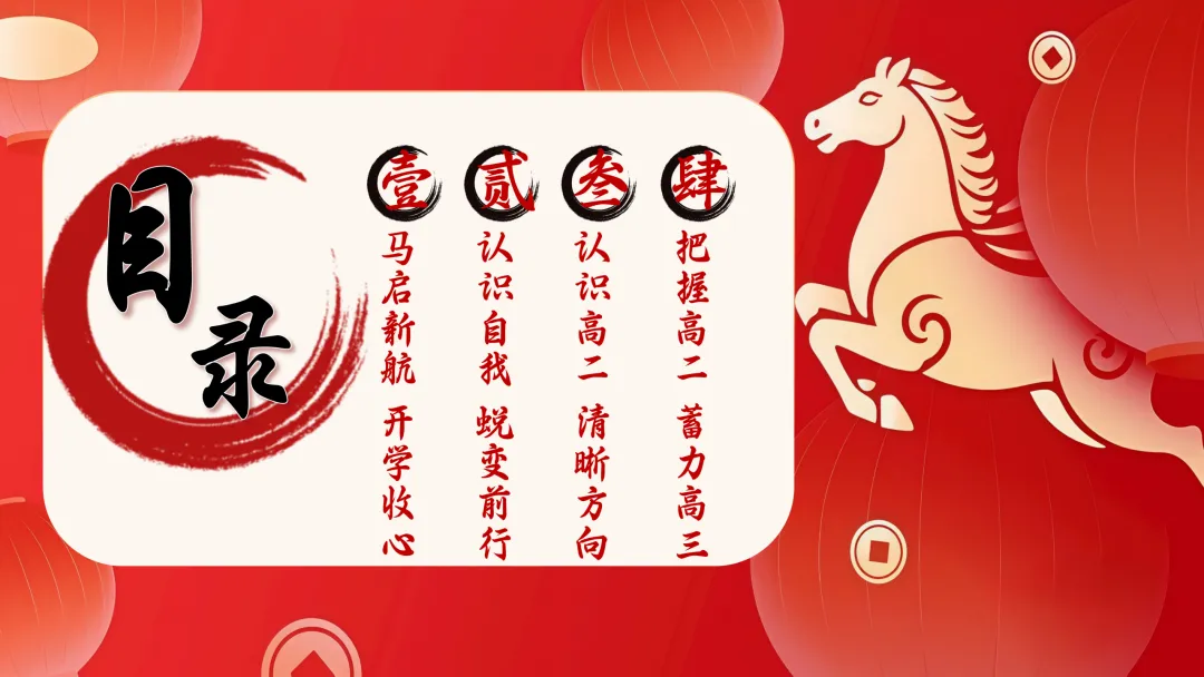 其主要内容分为4部分:01马启新航 开学收心;02认识自我 蜕变前行;03认识高二 清晰方向;04把握高二 蓄力高三。