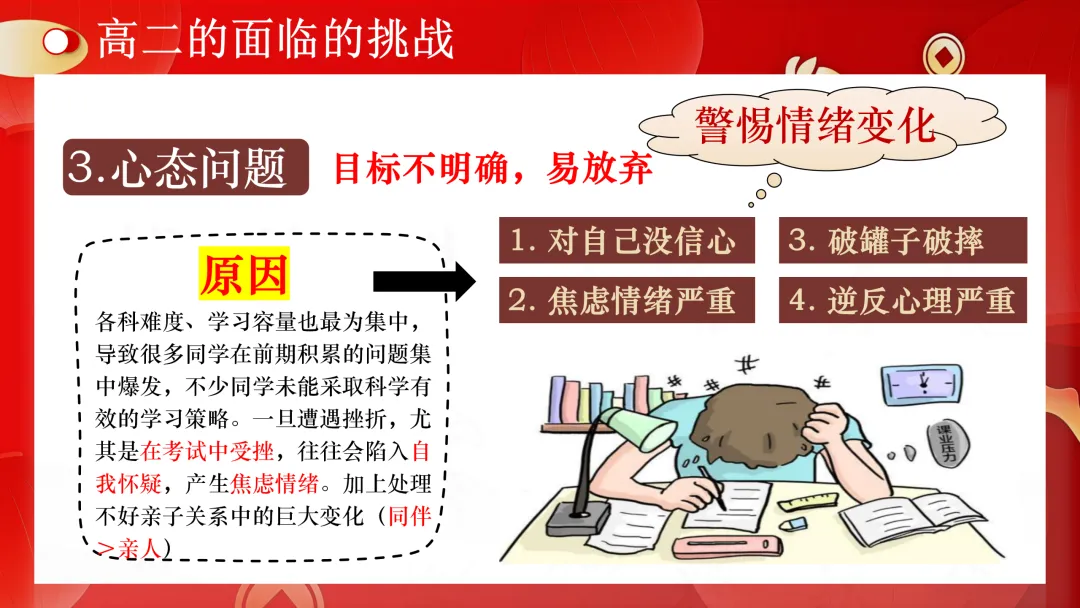①高二的成绩将决定高三的心态:高二成绩好,对高三的心态有极大的正面影响,相反则需要用很长一段时间甚至整个高三的第一轮复习时间才能进入状态。