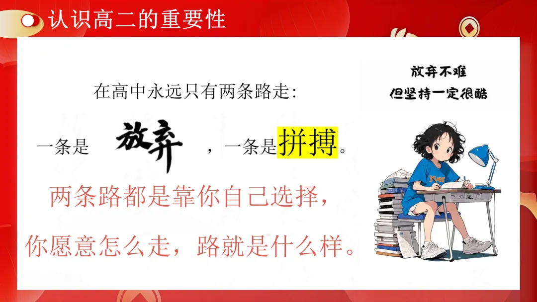 亲爱的同学们,春回大地,万象更新,在这生机勃勃的季节里,我们满怀憧憬与期待,迎来了新学期的开学第一课。高二,是高中阶段的关键转折点,是知识积累的攻坚期,也是我们人生道路上的重要分水岭。