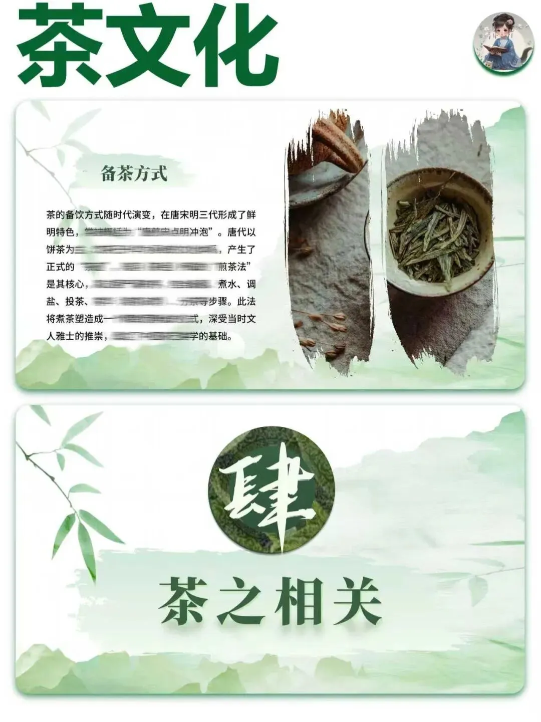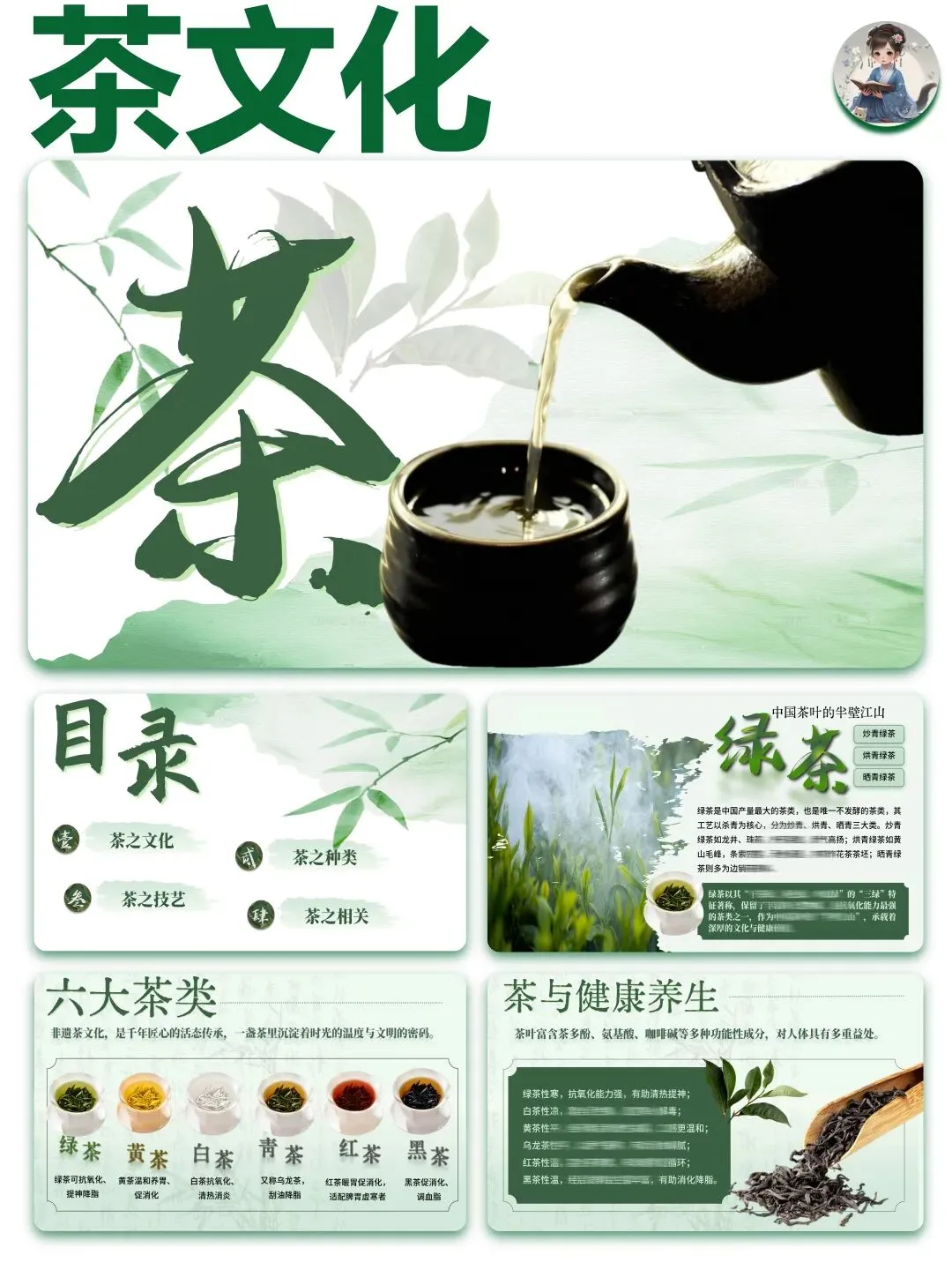 PPT包含展示的所有文字内容,包括茶文化,茶的种类,茶之技艺,茶之相关四个部分