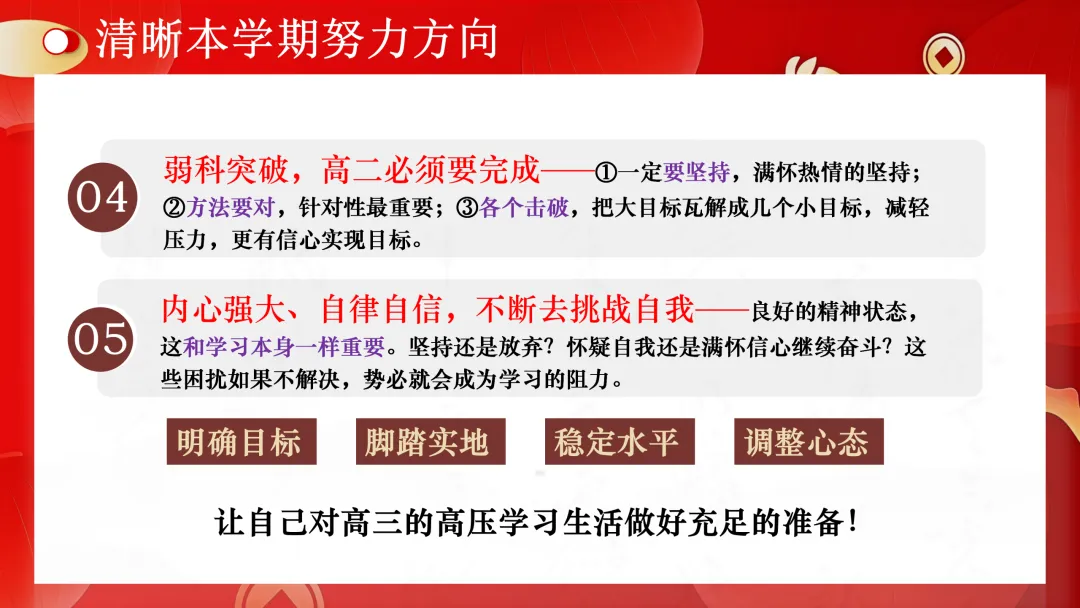 明确目标;脚踏实地;稳定水平;调整心态