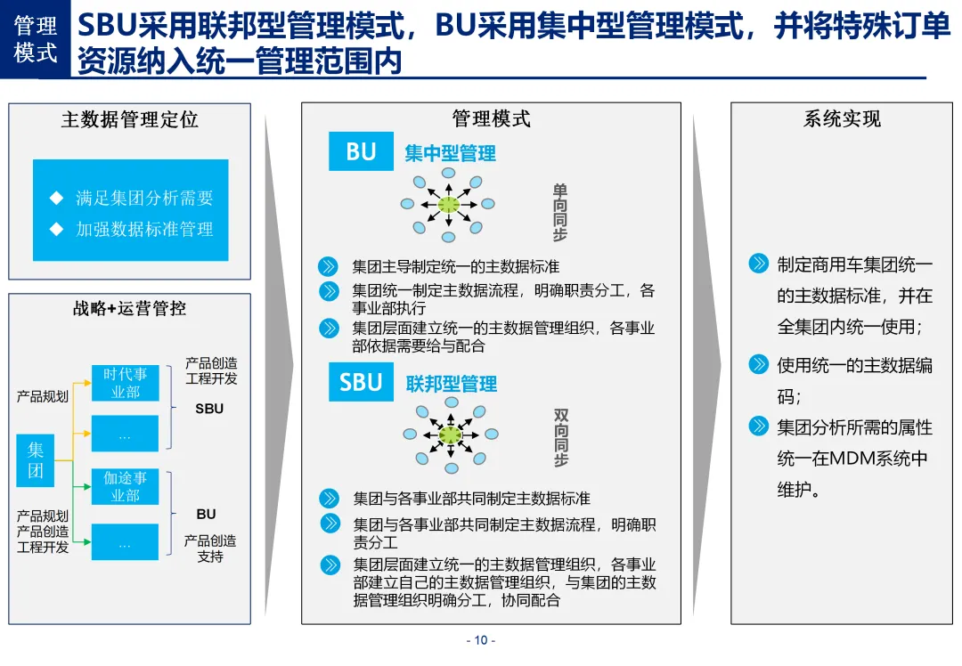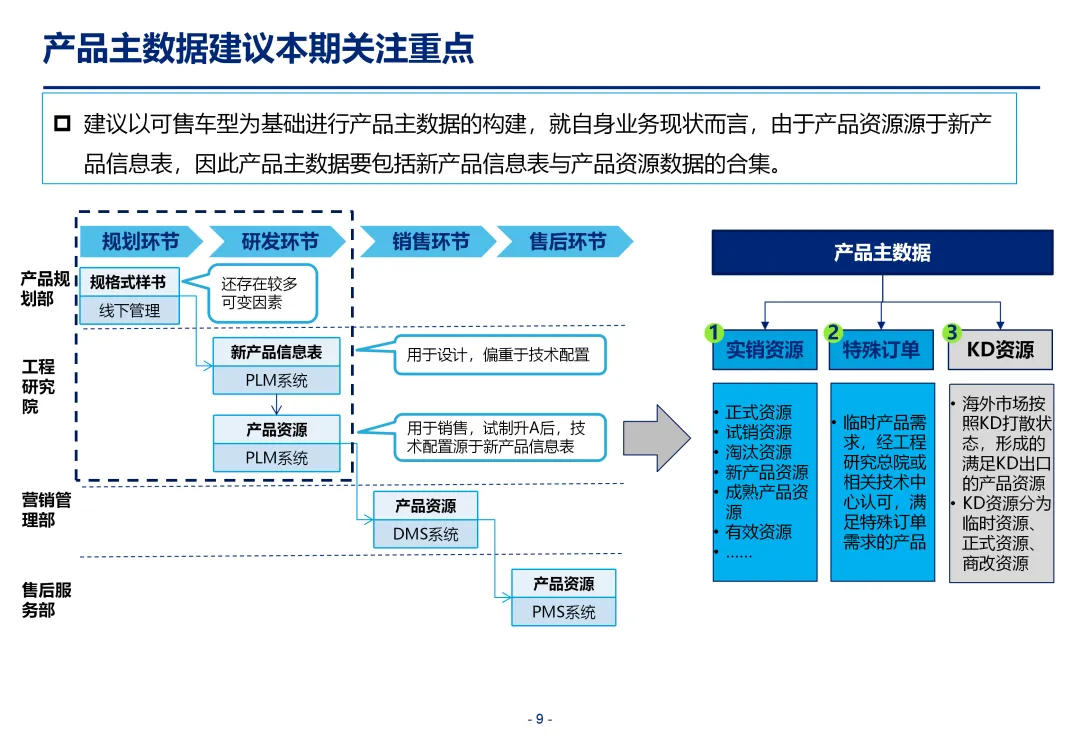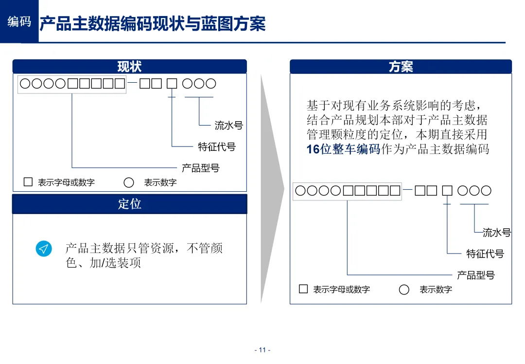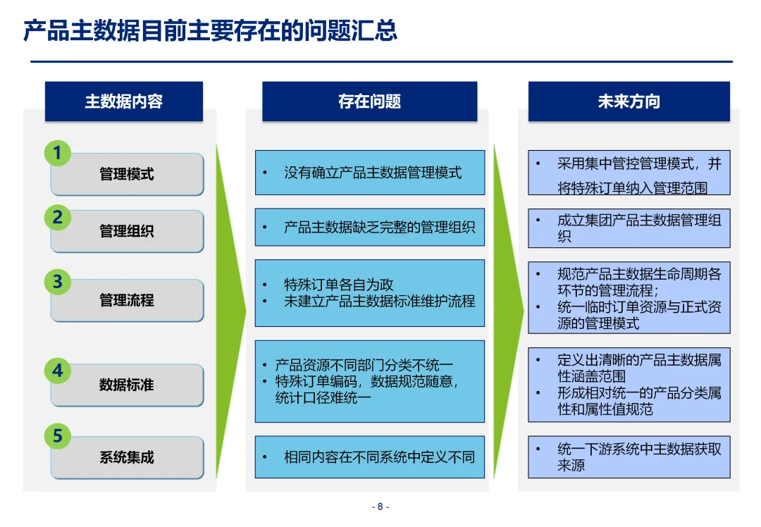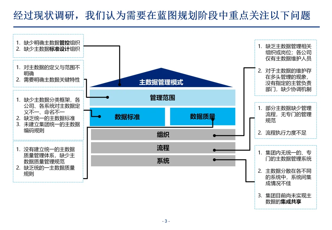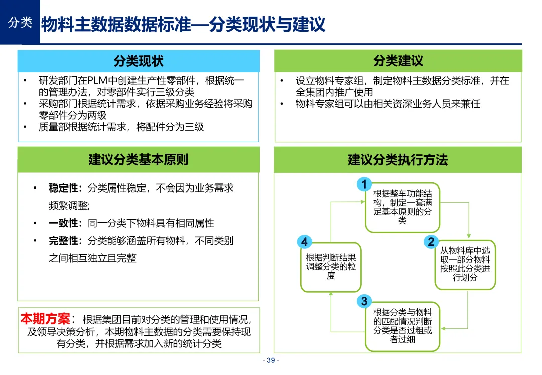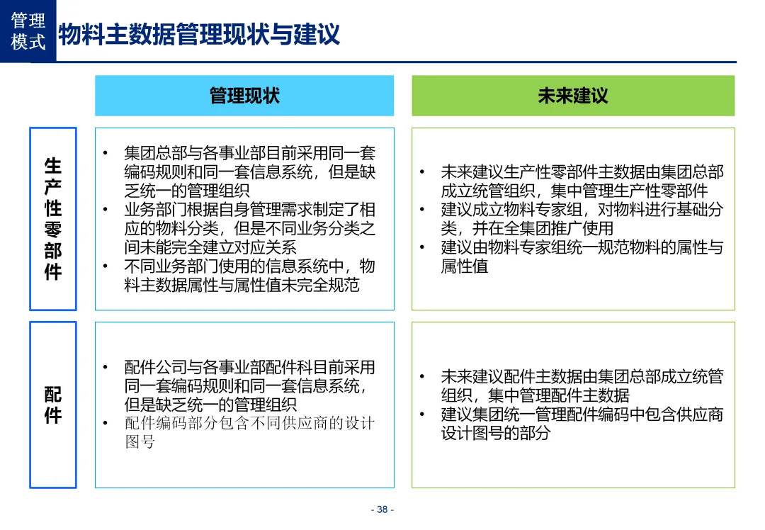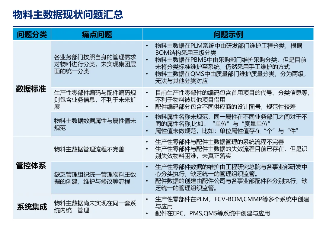 方案基于大量汽车行业项目调研,精准提炼了行业主数据管理的 6 大共性痛点,也是企业蓝图规划必须破解的核心问题:一是组织管控缺位,缺少明确的主数据管控与标准设计组织,无归口主管部门与跨部门协调机制,存在多头管理、权责不清的根源性问题;二是管理范围模糊,对主数据的定义、范围无明确界定,集团内各子公司、各系统对同一主数据的定义、命名规则不统一,形成天然业务壁垒;三是数据标准缺失,无集团统一的主数据分类框架、编码规则与属性标准,是数据不一致的核心诱因;四是管理流程失范,部分主数据缺少全生命周期管理规范,流程执行力度不足,主数据变更无审批、无追溯,极易引发生产停线、订单错误等运营事故;五是系统支撑不足,无集团级统一主数据管理系统,主数据分散在数十套异构系统中,系统间集成能力弱,无法形成集团统一经营数据视图;六是质量体系空白,未建立统一的主数据质量管理体系与检查规则,无法实现数据质量的全周期管控,最终导致财务报表失真、决策依据不可靠、合规风险高企。