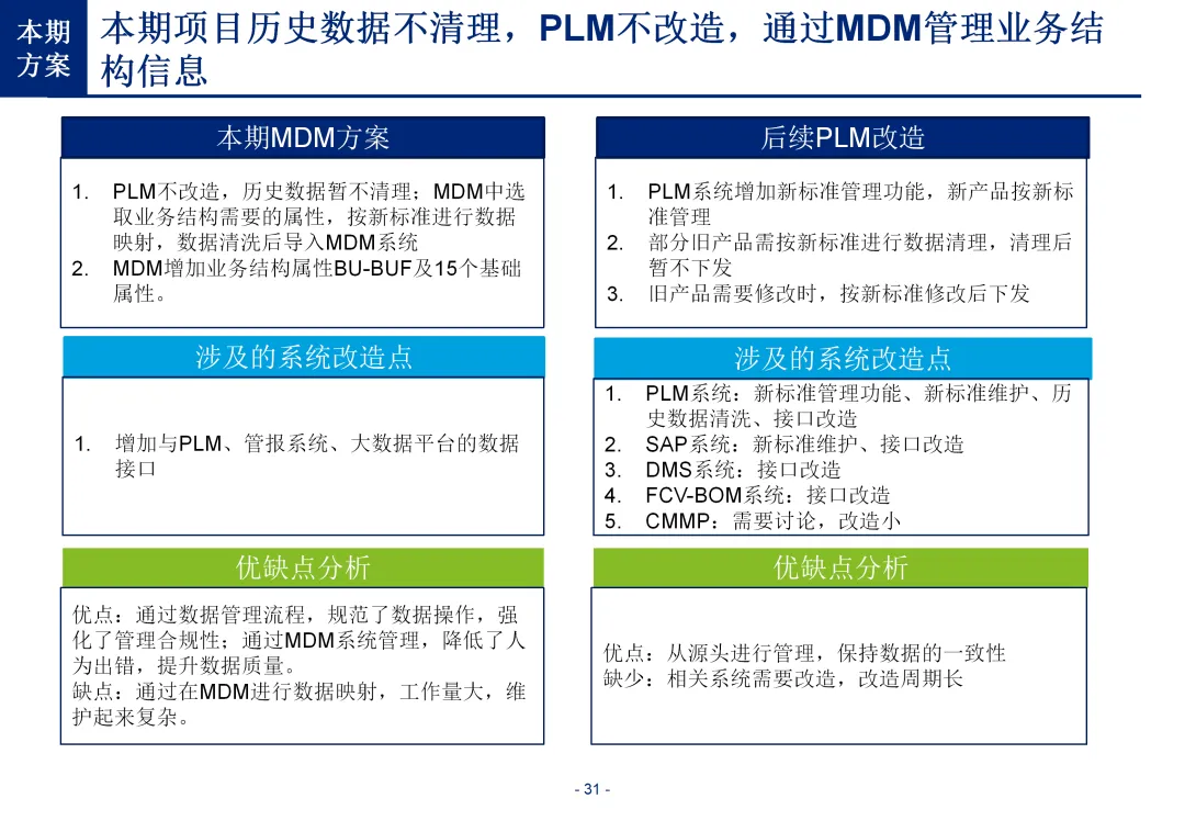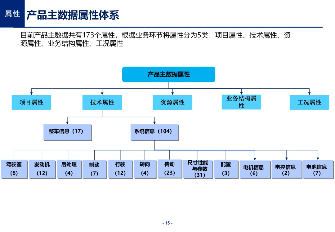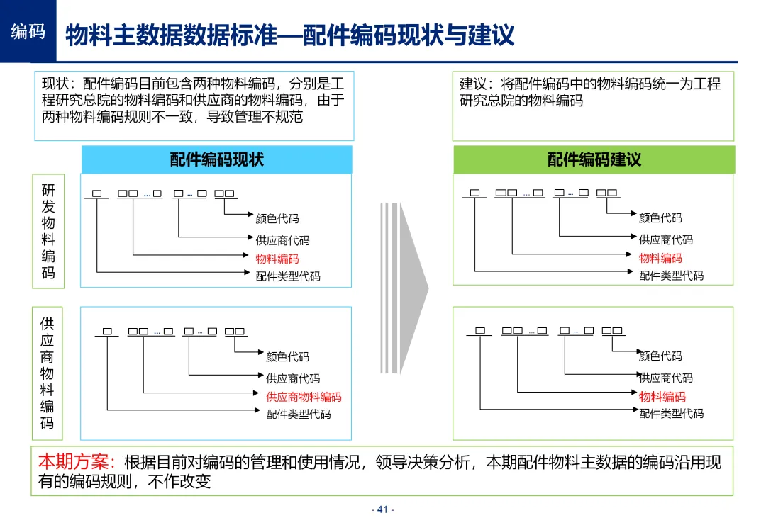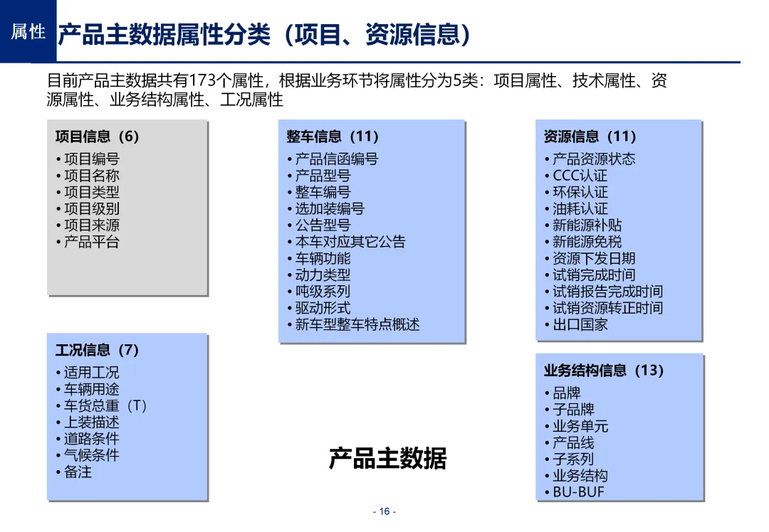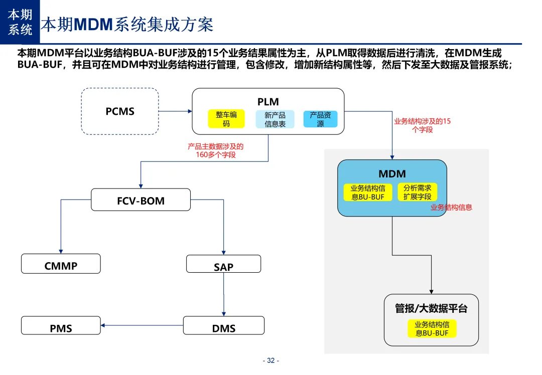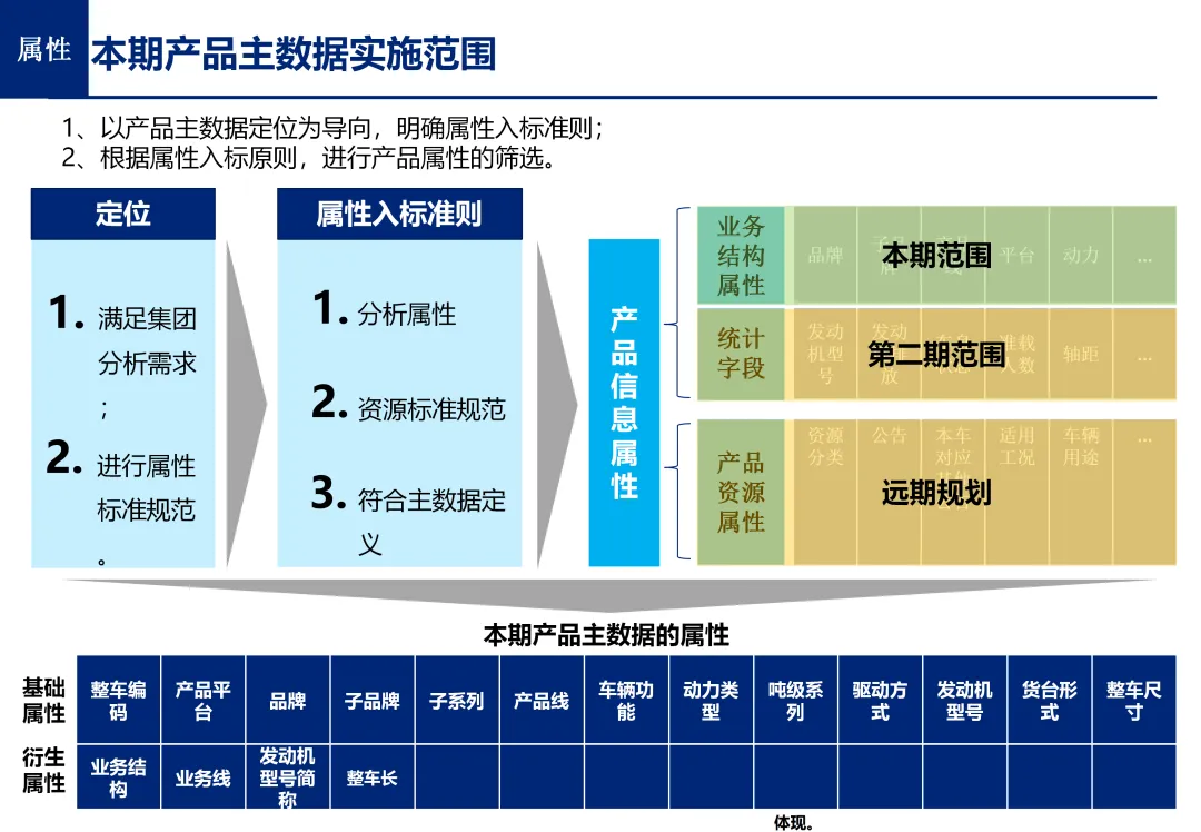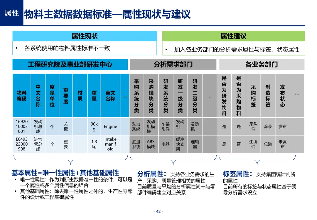 方案基于大量汽车行业项目调研,精准提炼了行业主数据管理的 6 大共性痛点,也是企业蓝图规划必须破解的核心问题:一是组织管控缺位,缺少明确的主数据管控与标准设计组织,无归口主管部门与跨部门协调机制,存在多头管理、权责不清的根源性问题;二是管理范围模糊,对主数据的定义、范围无明确界定,集团内各子公司、各系统对同一主数据的定义、命名规则不统一,形成天然业务壁垒;三是数据标准缺失,无集团统一的主数据分类框架、编码规则与属性标准,是数据不一致的核心诱因;四是管理流程失范,部分主数据缺少全生命周期管理规范,流程执行力度不足,主数据变更无审批、无追溯,极易引发生产停线、订单错误等运营事故;五是系统支撑不足,无集团级统一主数据管理系统,主数据分散在数十套异构系统中,系统间集成能力弱,无法形成集团统一经营数据视图;六是质量体系空白,未建立统一的主数据质量管理体系与检查规则,无法实现数据质量的全周期管控,最终导致财务报表失真、决策依据不可靠、合规风险高企。