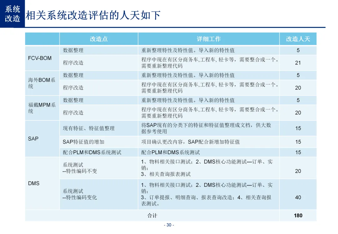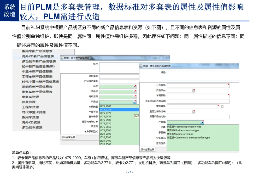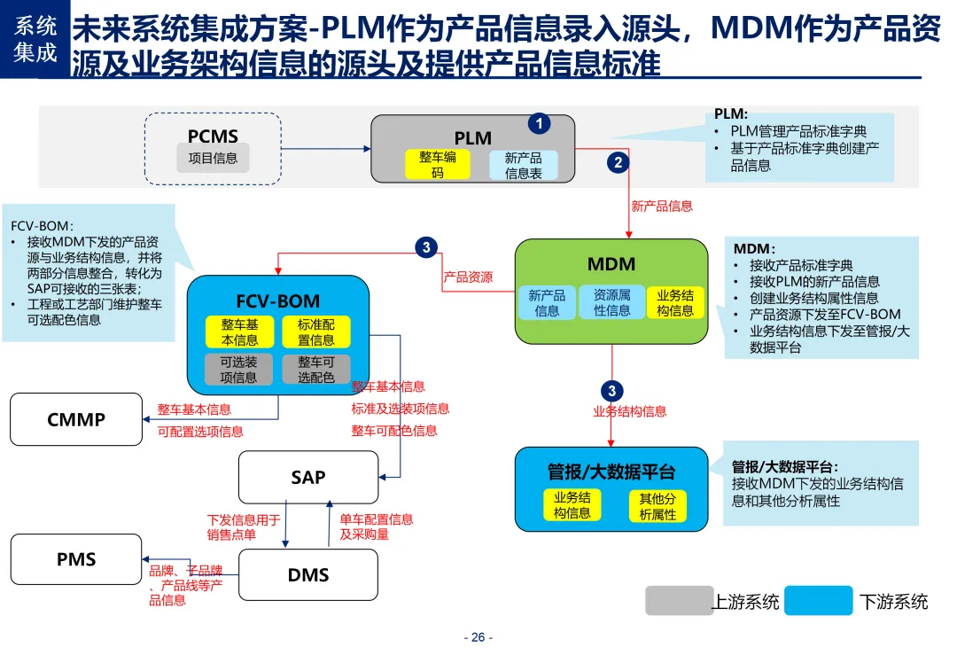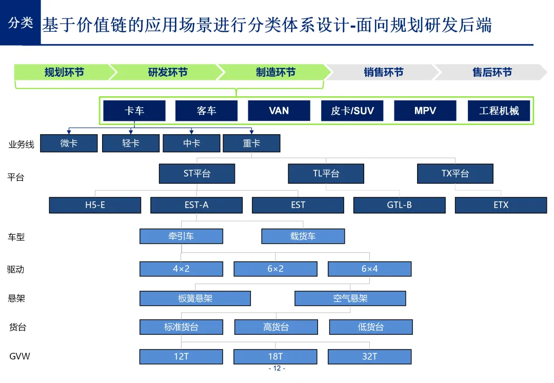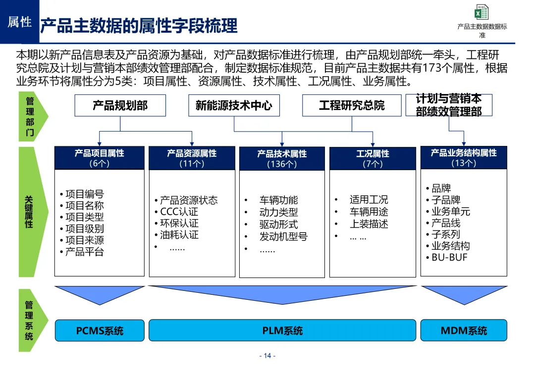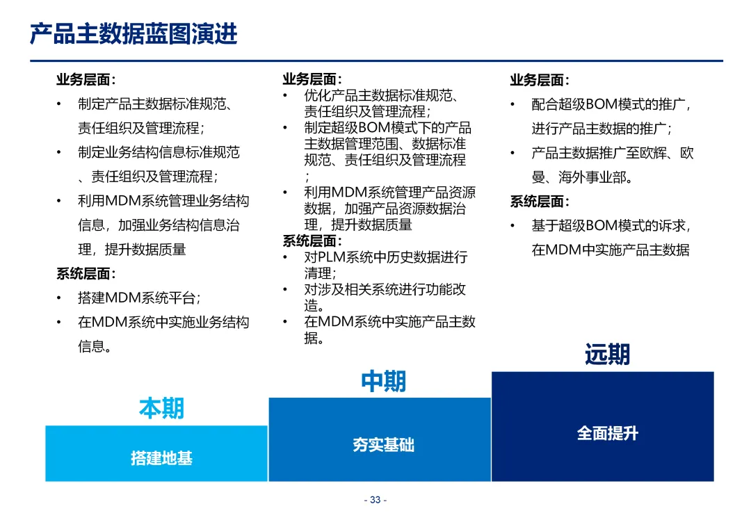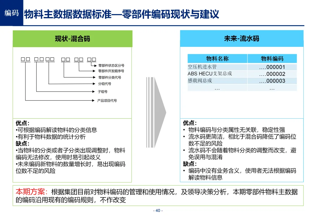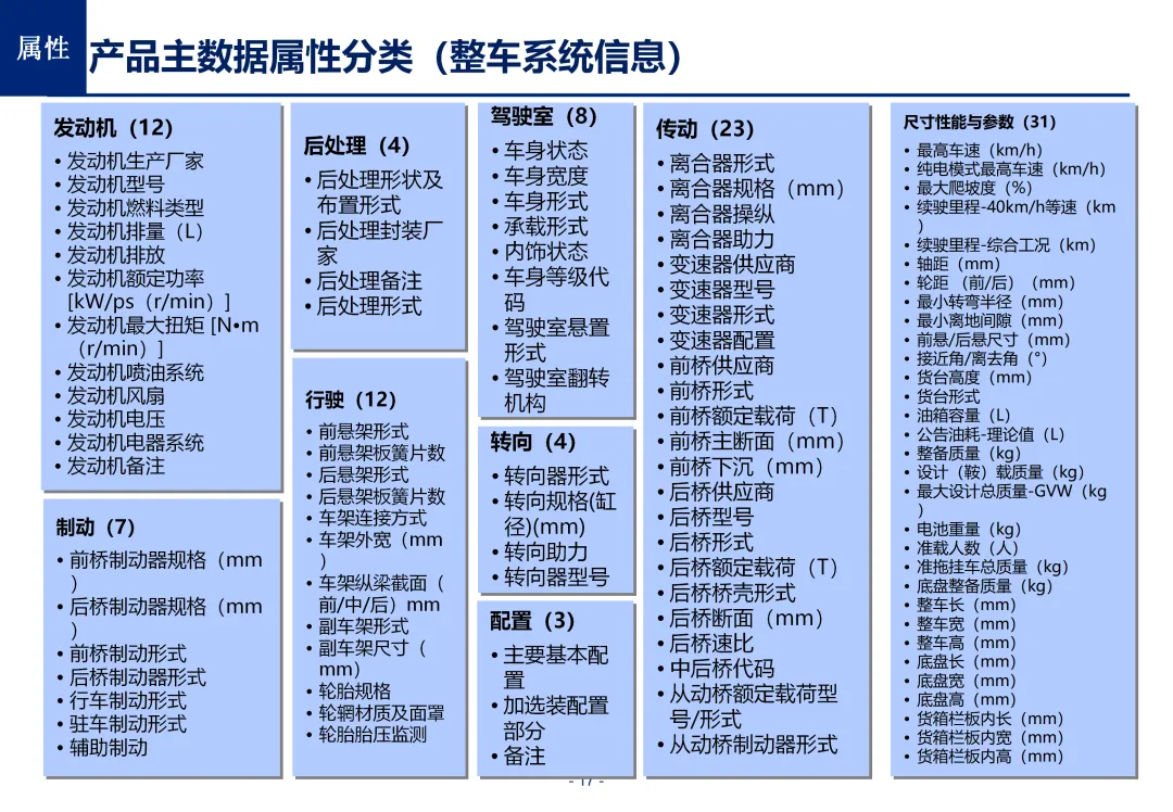 方案基于大量汽车行业项目调研,精准提炼了行业主数据管理的 6 大共性痛点,也是企业蓝图规划必须破解的核心问题:一是组织管控缺位,缺少明确的主数据管控与标准设计组织,无归口主管部门与跨部门协调机制,存在多头管理、权责不清的根源性问题;二是管理范围模糊,对主数据的定义、范围无明确界定,集团内各子公司、各系统对同一主数据的定义、命名规则不统一,形成天然业务壁垒;三是数据标准缺失,无集团统一的主数据分类框架、编码规则与属性标准,是数据不一致的核心诱因;四是管理流程失范,部分主数据缺少全生命周期管理规范,流程执行力度不足,主数据变更无审批、无追溯,极易引发生产停线、订单错误等运营事故;五是系统支撑不足,无集团级统一主数据管理系统,主数据分散在数十套异构系统中,系统间集成能力弱,无法形成集团统一经营数据视图;六是质量体系空白,未建立统一的主数据质量管理体系与检查规则,无法实现数据质量的全周期管控,最终导致财务报表失真、决策依据不可靠、合规风险高企。