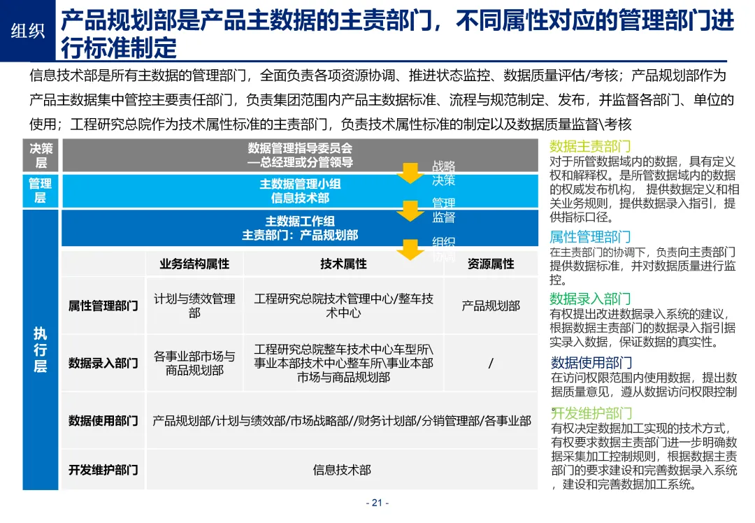 在 “由谁管” 的权责体系上,方案针对行业 “多头管理、权责不清” 的通病,设计了决策层 - 管理层 - 执行层三级管控架构。决策层负责主数据管理战略、顶层制度的决策与跨部门资源协调;管理层负责主数据标准、管理流程、质量规则的制定与全集团统筹监督;执行层负责主数据日常维护、流程发起与问题反馈,彻底厘清了各层级的核心职责。