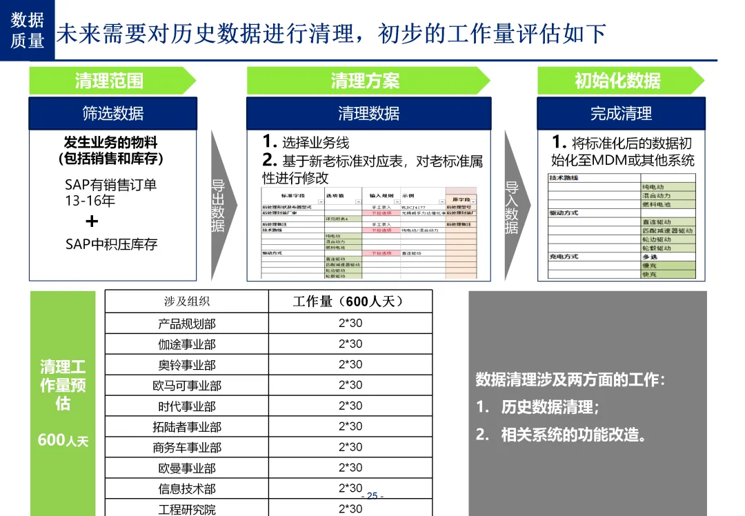 方案不仅给出了顶层设计,还提供了可直接落地的全周期项目实施路径,同时明确提示了行业高频的项目延期风险。方案将主数据管理平台实施分为 6 大核心阶段,形成了精细化的项目管控框架:第一阶段为项目准备与启动,核心完成现状调研、高层与干系部门访谈,拉通高层共识、明确项目目标边界;第二阶段为业务蓝图设计,核心完成主数据编码与属性梳理、治理结构与流程标准设计,是决定项目落地效果的核心灵魂阶段;第三阶段为系统详细设计与实现,核心完成主数据模型、系统集成、质量规则开发与全模块测试;第四阶段为系统测试与上线准备,核心完成用户培训、UAT 测试、历史数据清洗与初始化,其中历史数据清洗是汽车行业项目的核心难点,也是最易导致项目延期的环节;第五阶段为系统上线试运行,完成系统切换与上线运维,验证业务适配性并完成优化调整;第六阶段为上线支持与终验,完成知识转移与长效运营体系搭建,最终完成项目验收。
