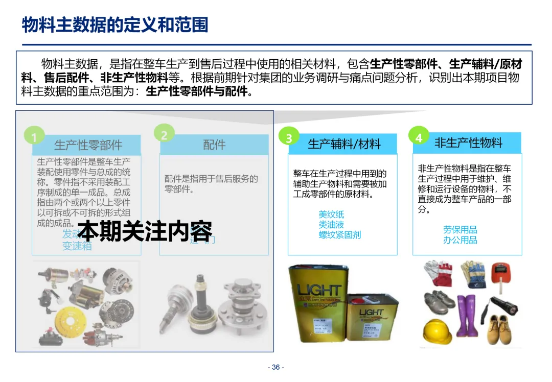 在 “管什么” 的核心范畴上,方案精准锚定汽车制造业 6 大核心主数据域,覆盖研、产、供、销、财全业务链路。其中产品与物料主数据是行业核心基础,整车产品涉及上万个零部件,从研发、工艺、生产到售后 BOM 的全周期拉通,完全依赖统一的产品与物料主数据,这也是行业一物多码、库存积压、呆滞料高企的核心症结;供应商与经销商客商主数据,是全球化供应链集中采购、渠道精细化管控的核心前提;会计科目与组织架构主数据,则是集团财务管控、组织权责划分的核心底座,直接决定了集团合并报表的准确性与核算合规性。