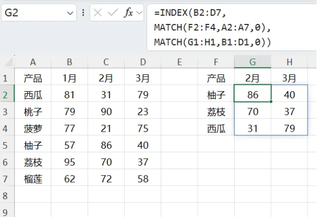 =INDEX(B2:D7,MATCH(F2:F4,A2:A7,0),MATCH(G1:H1,B1:D1,0))