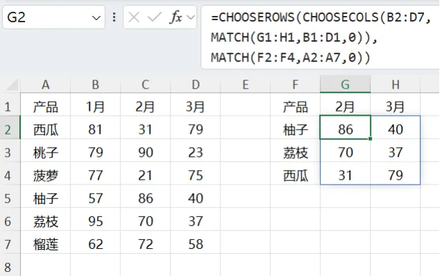 =CHOOSEROWS(CHOOSECOLS(B2:D7,MATCH(G1:H1,B1:D1,0)),MATCH(F2:F4,A2:A7,0))