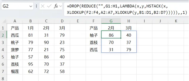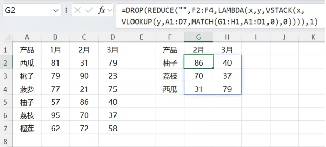 同样的套路,把前文说到的经典VLOOKUP+MATCH作为核心计算,REDUCE+LAMBDA使其多次执行,VSTACK把每次计算的结果纵向堆叠:
