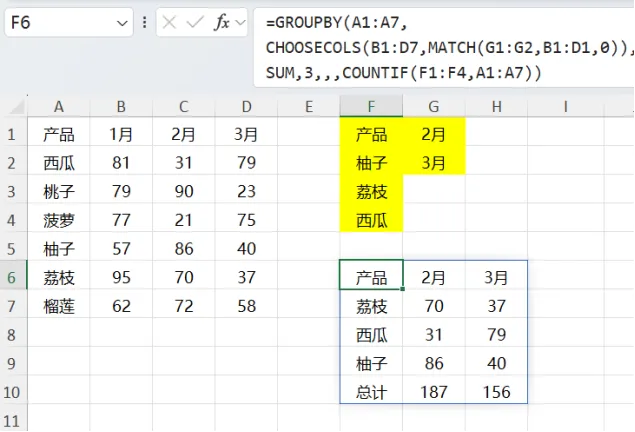 GOUPBY是高版本中强得可怕的数据汇总函数,此处通过第二参数中的CHOOSECOLS获取指定月份的数据,第七参数中的COUNTIF筛选指定的产品,再用SUM汇总数据,因为数据中并没有同类项,SUM并不会产生任何的求和计算。