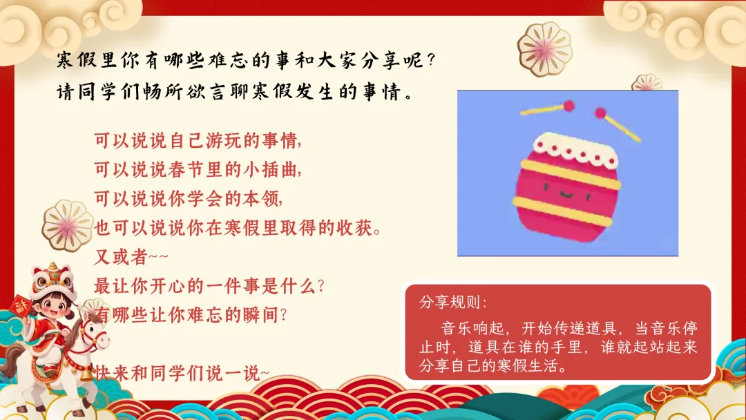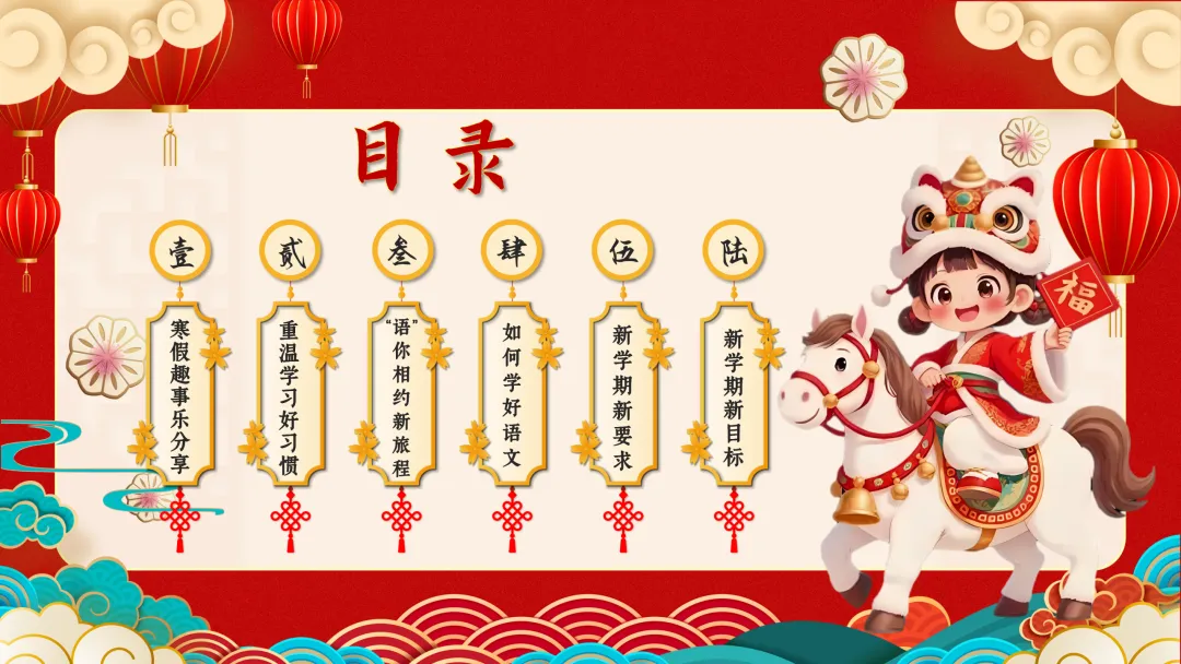 今天这节课是我们二年级的第一节课,非常重要,希望接下来同学们都能认真听、积极发言,能做到吗?我们这节课分为六个部分:一、分享寒假趣事;二、重温学习好习惯;三、“语”你相约新旅程;四、如何学好语文;五、新学期新要求;六、新学期新目标。