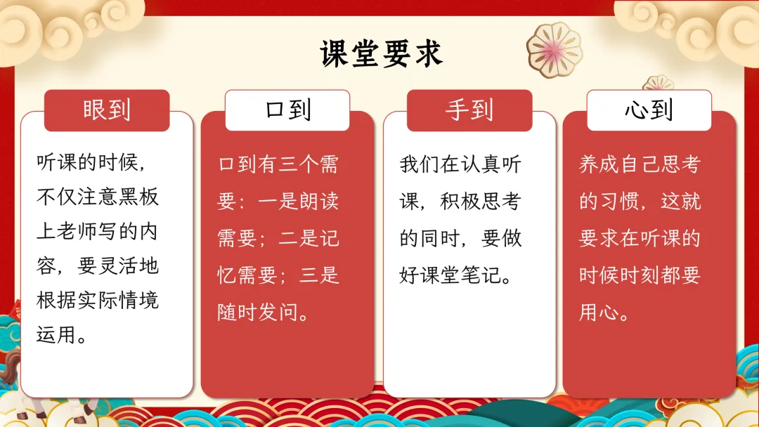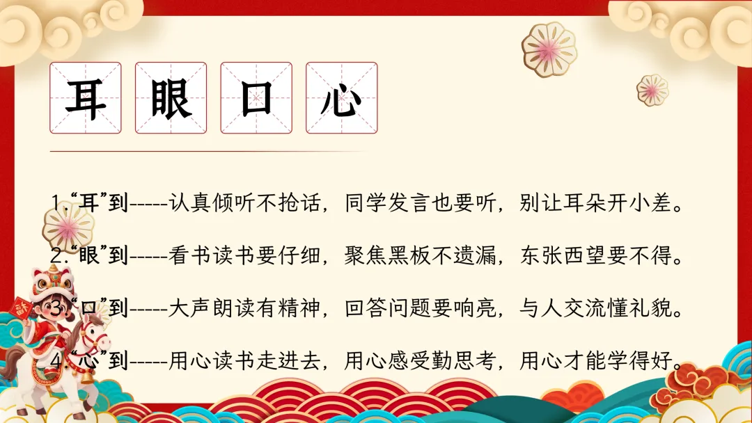 ① “耳”到——认真倾听不抢话,同学发言也要听,别让耳朵开小差。