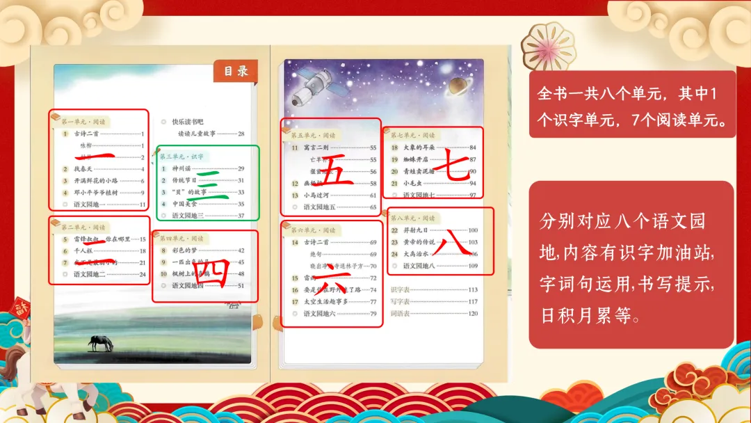 本学期的语文,我们从目录可以看出分为两种类型:一是识字单元,一是课文单元。