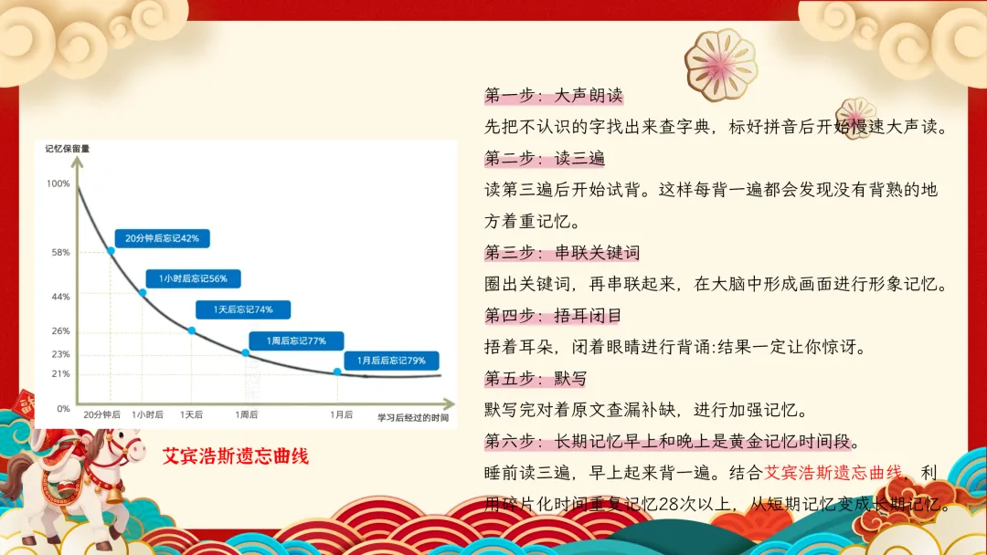 第六步:长期记忆早上和晚上是黄金记忆时间段。睡前读三遍,早上起来背一遍。结合艾宾浩斯遗忘曲线,利用碎片化时间重复记忆28次以上,从短期记忆变成长期记忆。