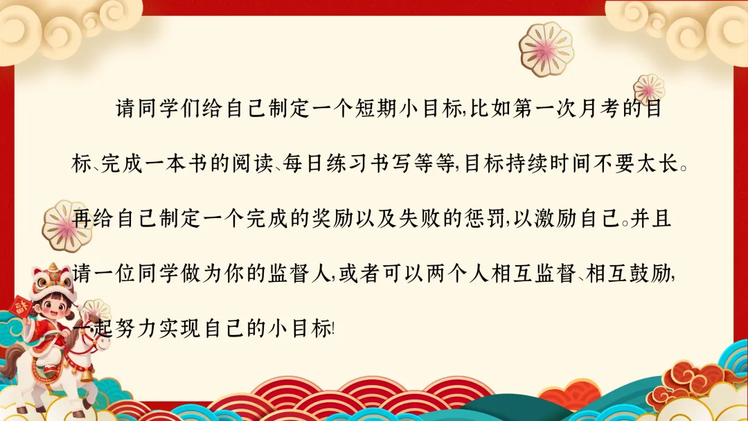亲爱的同学们,大家好呀!新学期的航程又开始啦!新学期,新起点,新气象,希望同学们能信心百倍地投入学习、生活中,老师将陪伴在你们左右,让我们去迎接新的挑战,创造更团结友爱的班级吧!